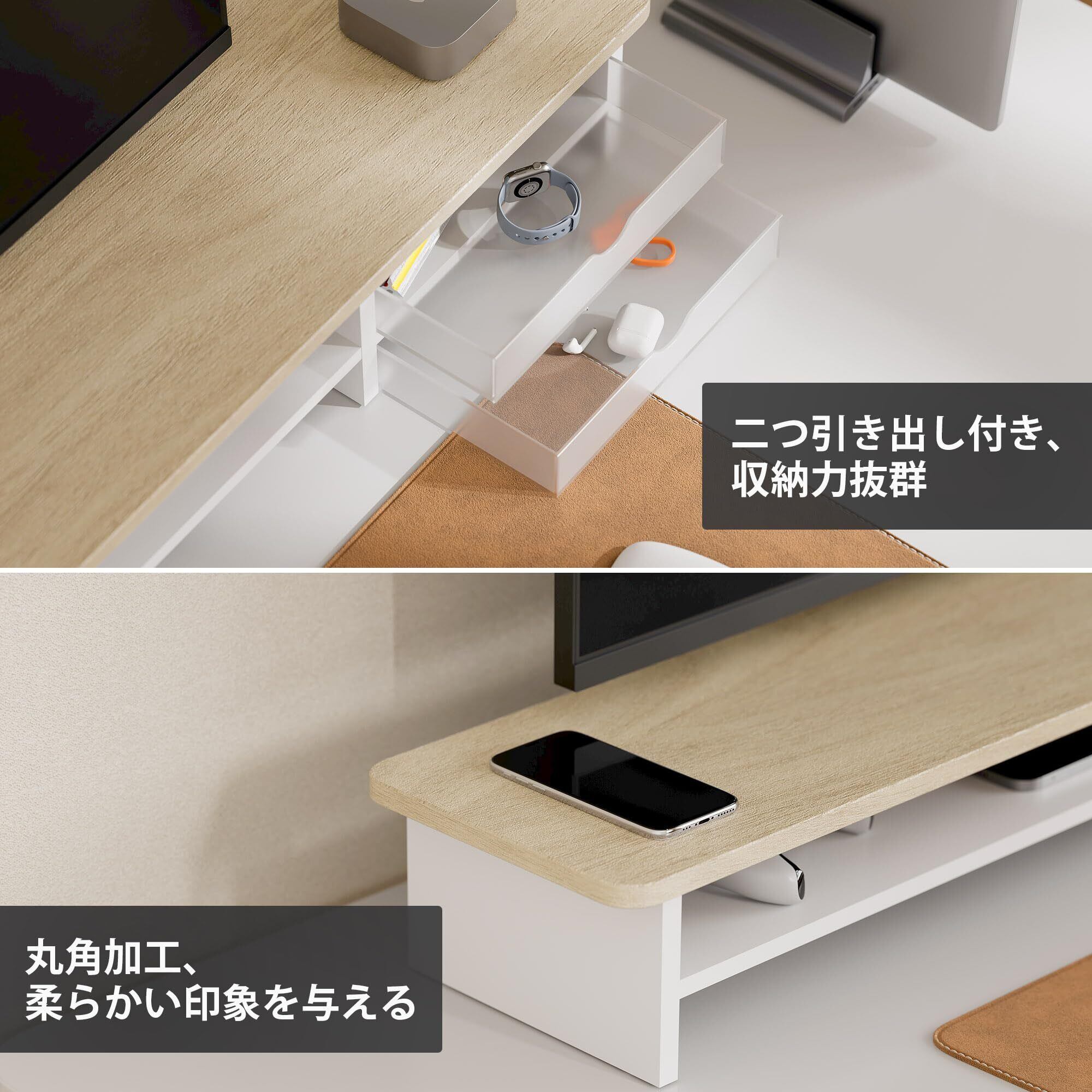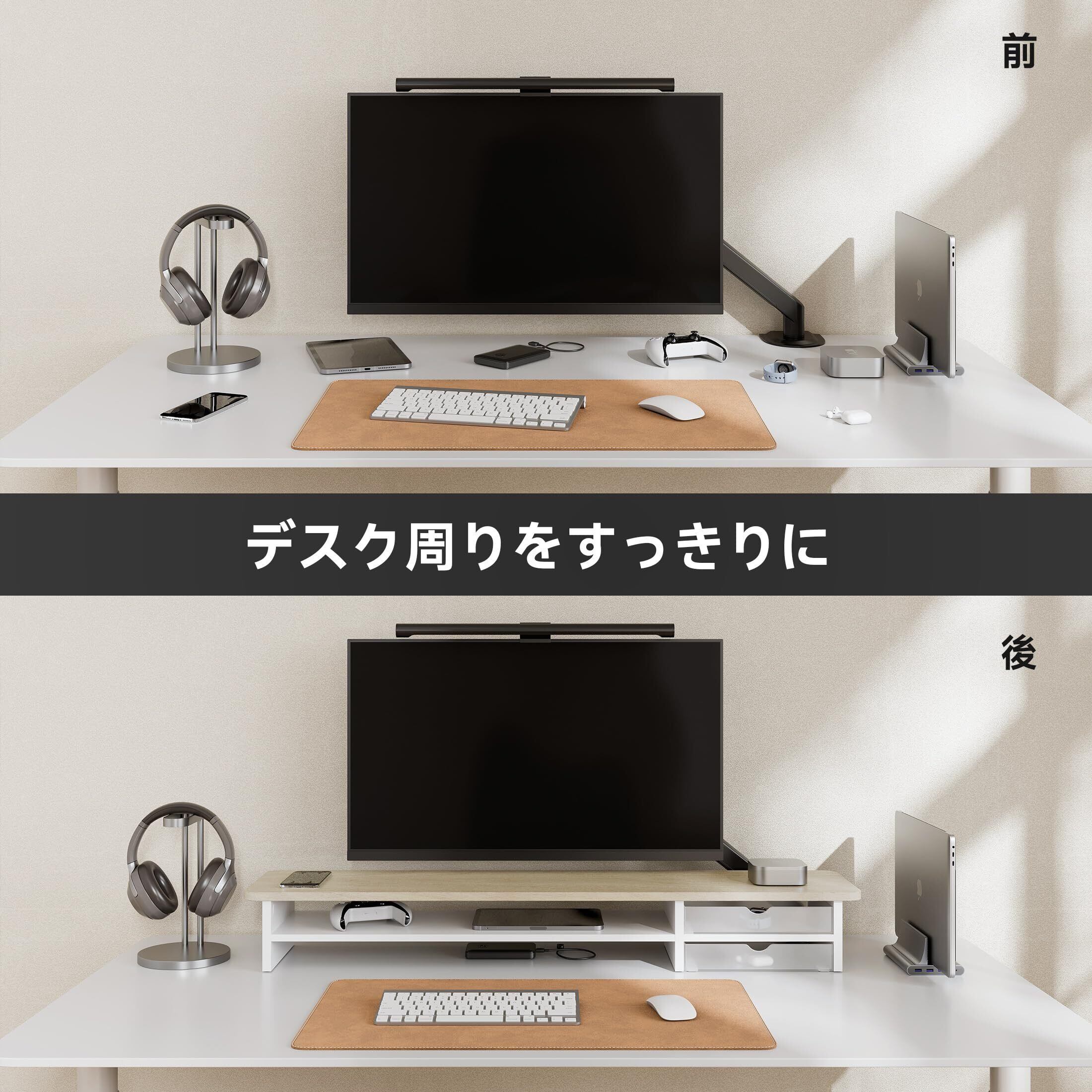 【便利な大容量収納・卓上をすっきりに】モニター台は2段引き出し式でモノを種類ごとに仕切りで収納できます。左(右)側は使いやすいオープン式でスマホやタブレットはもちろん、 、キーボード、マウスなどの周辺機器を整理でき、必要な時は物をすぐ手に取れます。右(左)側は引き出し2つがあり、見せたくない物もちゃんと収納できます。卓上スペースを無駄なく広々ご利用いただけます。