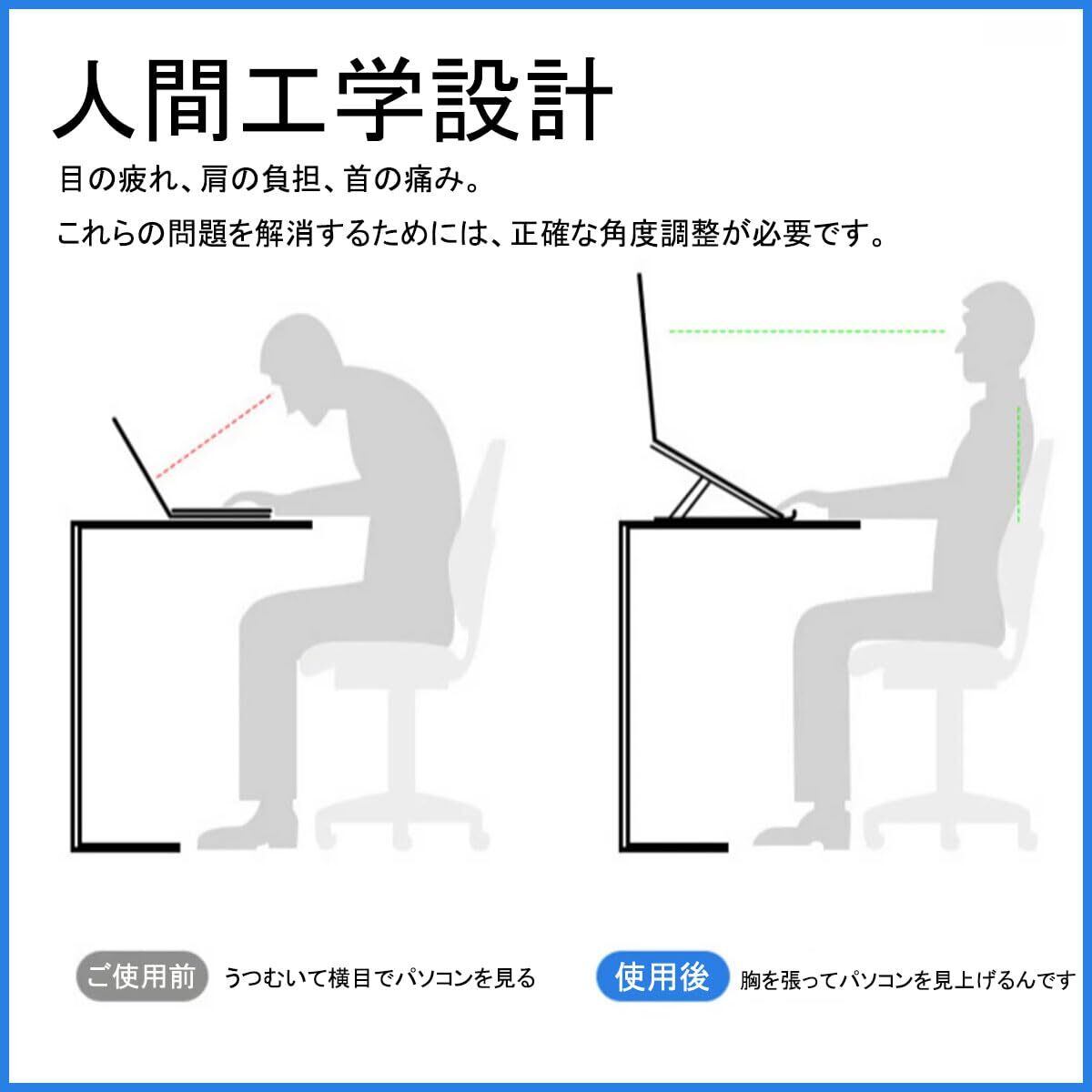 【人間工学設計&7段階高さ調整可能】:ノートパソコンスタンドを使用することにより、目線を上げ正しい姿勢を保ち、首の疲れや肩凝りや腰痛の改善をサポートします。本パソコンスタンドは7段階高さ調整ができ、お好みの高さに合わせることで、猫背を防ぎ長時間のデスクワークでも体への負担を低減します。