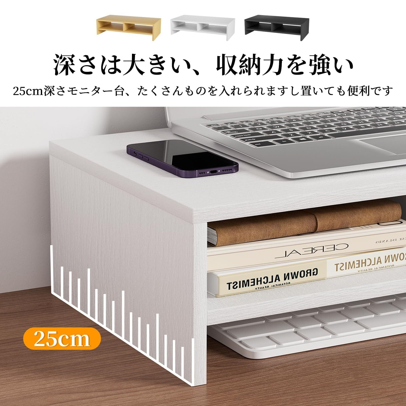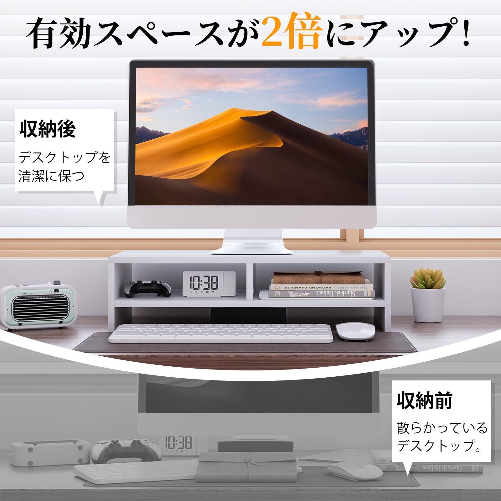 【商品仕様】机上ラックの本体サイズ:幅50*奥行25cm*高さ14cm本体重量:約2.5kg。 耐荷重 : 40KG 本モニター台はMDF/合成繊維板で作られます。この素材はコストパフォーマンスが優れて、環境にやさしいです。