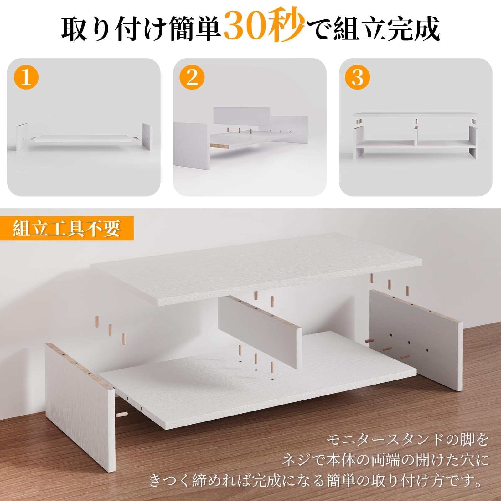 【簡単の取付方】机上台の取り付けは非常に簡単で、工具の使用は不要で、モニタースタンドの脚をネジで本体の両端の開けた穴にきつく締めれば完成になる簡単の取り付け方です。こんな素晴らしい商品をご家族や友達へのプレゼントとして喜ばせるものです。