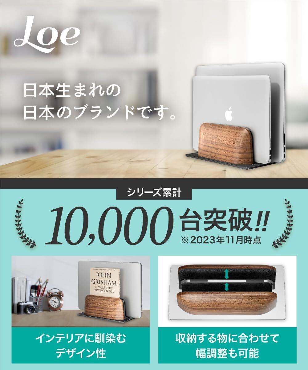 LOE(ロエ) ノートパソコン スタンド 縦置き 収納ホルダー 2台対応 幅調節可 木製デザイン アルミ合金 全機種対応 MacBook/Surface/iPad 省スペース PCスタンド (シルバー)