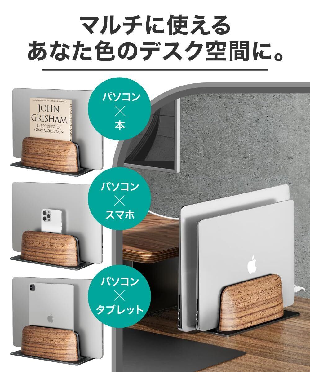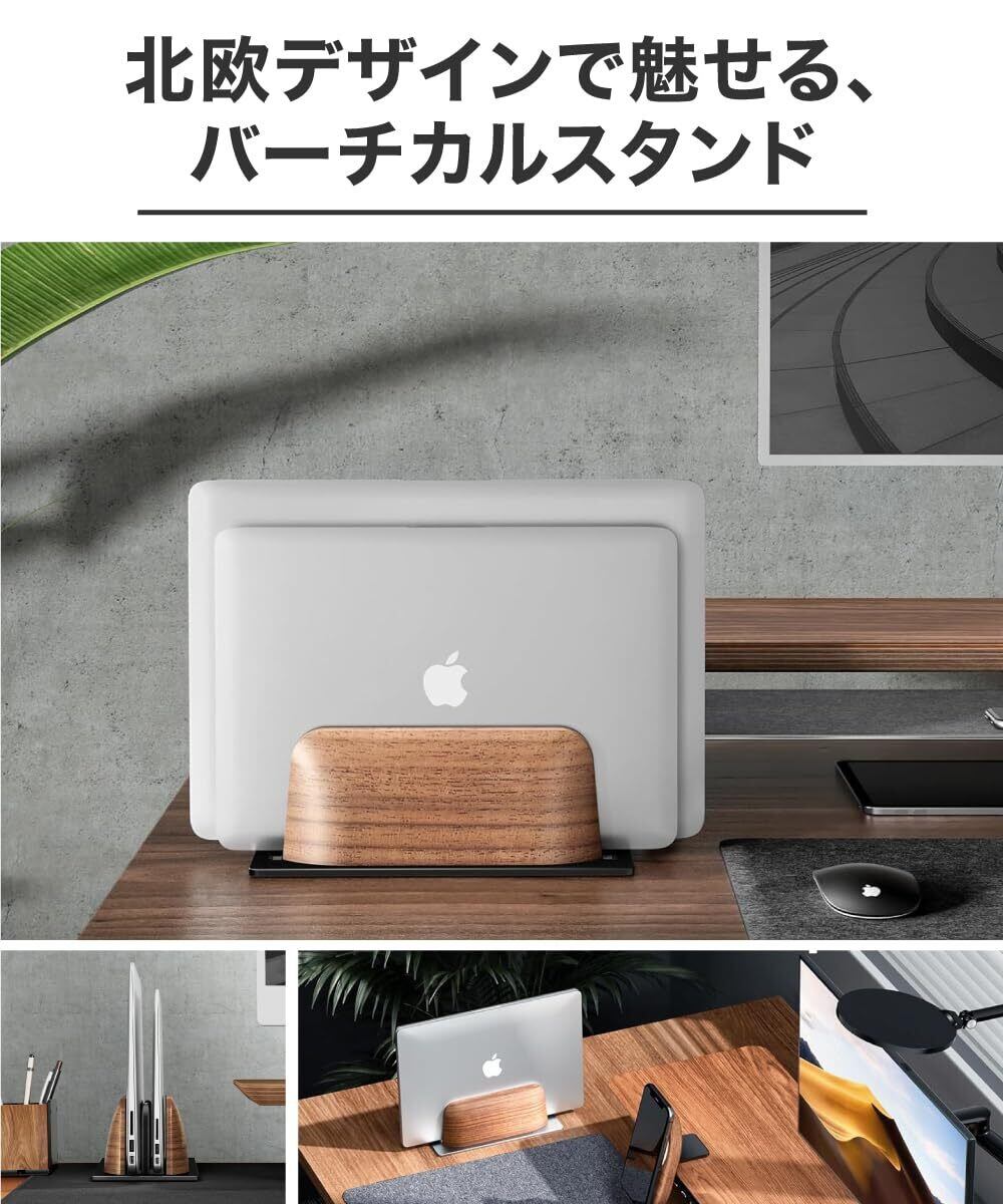 【 縦置き パソコンスタンド 】ブラックウォルナット材とアルミニウムを使用した 2台 対応 縦型 ノートパソコンスタンド。MacBook Pro、Surface、Galaxy Book、Lenovo、HP、Dell、Chromebook、ThinkPadなど、最大17インチまでのノートパソコンやタブレットに対応。自然な素材とアルミニウムの豊かさや魅力を組み合わせた、視覚的に美しいデザインです。上質な素材を使用し、仕事を快適で楽しいものにすることをサポートします。