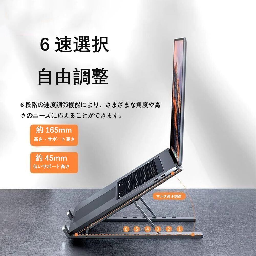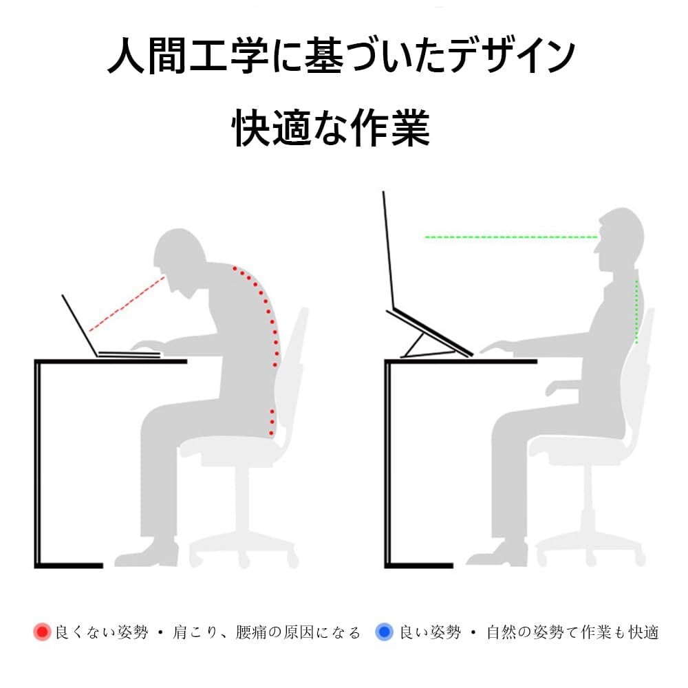 ラップトップ・スタンドは、最適な目線の高さと作業姿勢のために6段階の角度調節が可能で、人間工学に基づいたデザインが快適な作業環境を作り出し、長時間の作業でも疲れを感じさせません。 緊張姿勢を避け、背中や腰の痛みを和らげます。