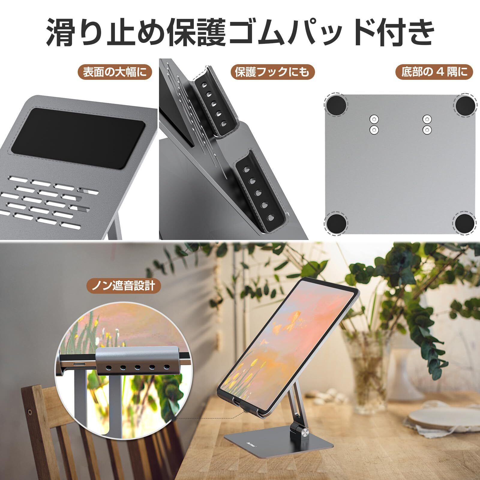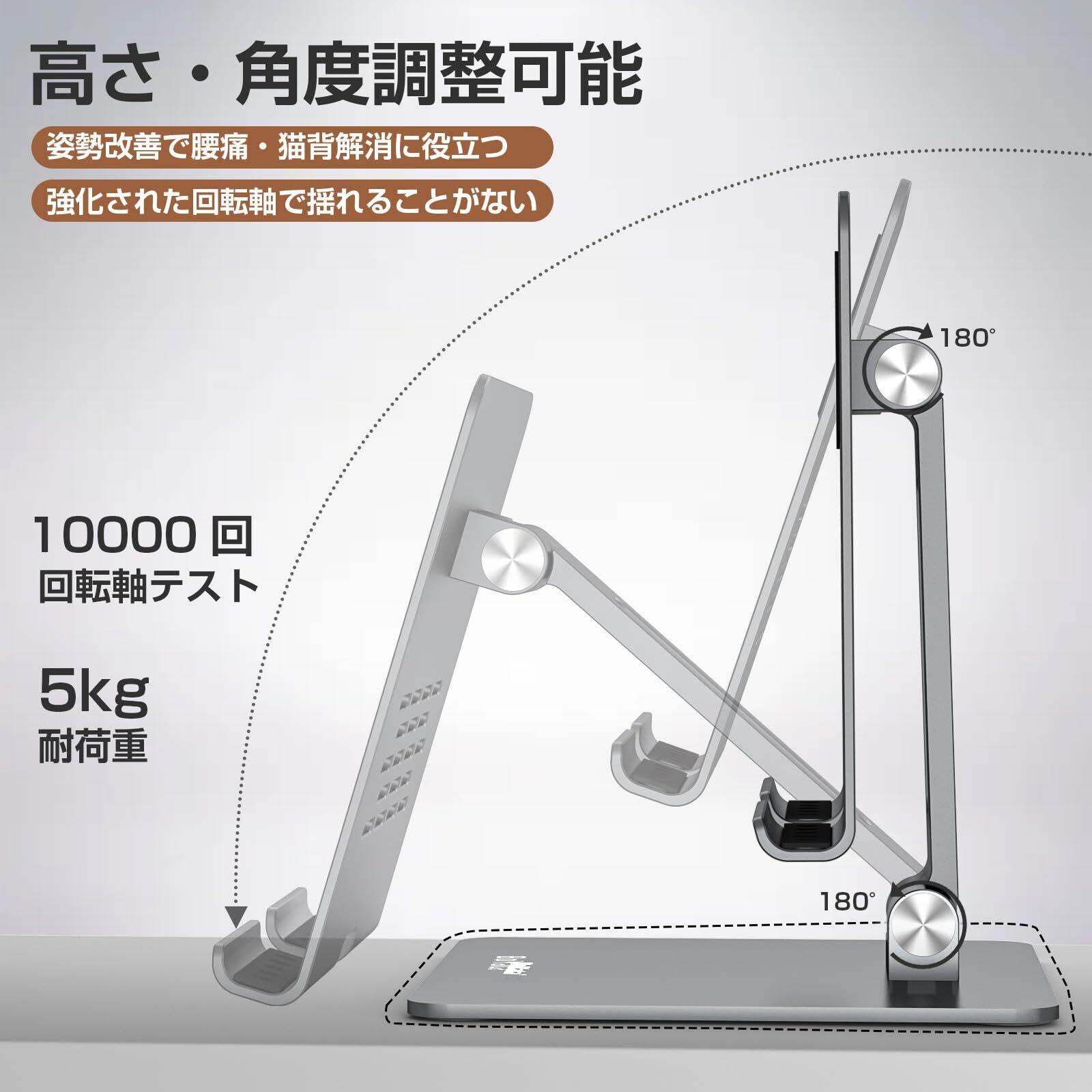 【放熱対応・精巧なデザイン】 全炭素鋼製のiPadスタンドが耐久性と放熱性にも優れてデバイスの自然放熱を実現して、タブレットの運行スピードをアップできます。支柱には充電ケーブルを通す空間が設計されて、充電しながらタブレットを使用可能で、線の整理も便利になります。タブレットiPadスタンドのシンプルで表面加工や仕上げも綺麗で高級感があり、室内のインテリアに合わせやすく、電子製品にも非常に相性が良いです。