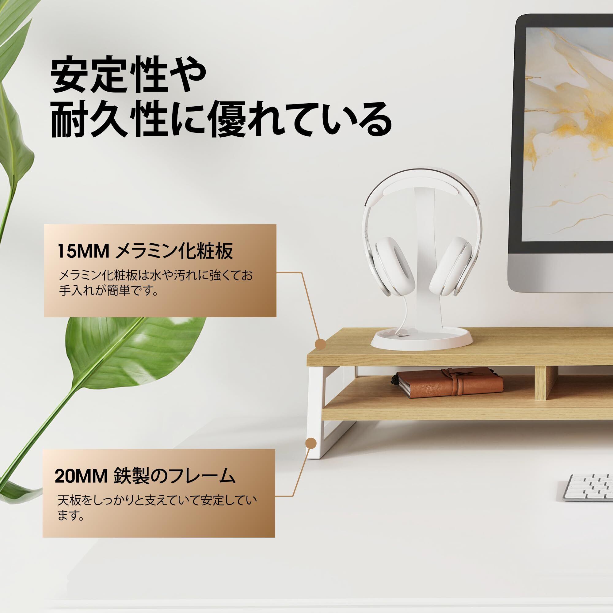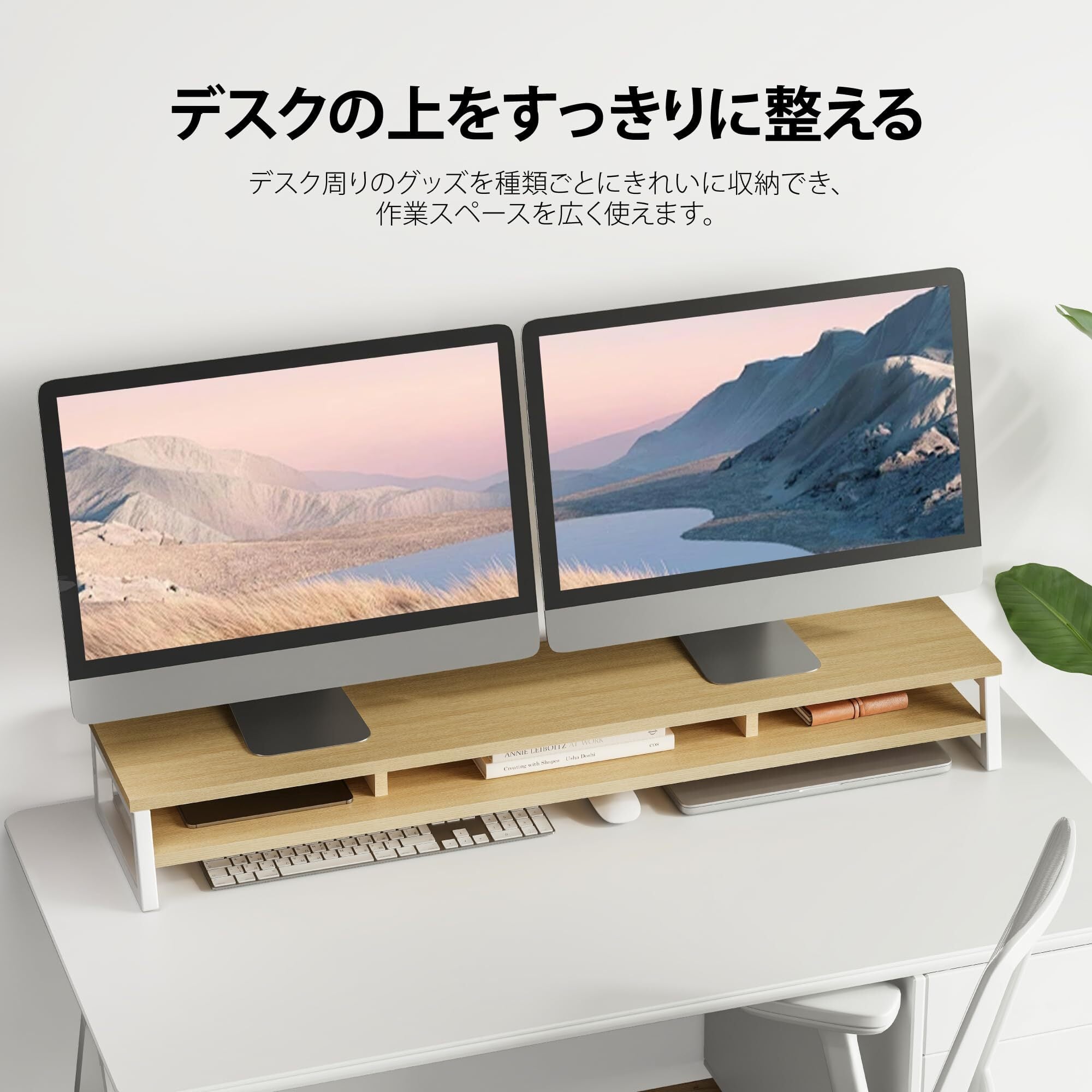 Fenge モニター台 卓上 デスクシェルフ モニタースタンド パソコン台 2段 木製 幅108cm pc台 机上台 デュアルモニター 台 机上ラック 卓上台 デスク周り収納 ディスプレイ 台 (オーク&白)