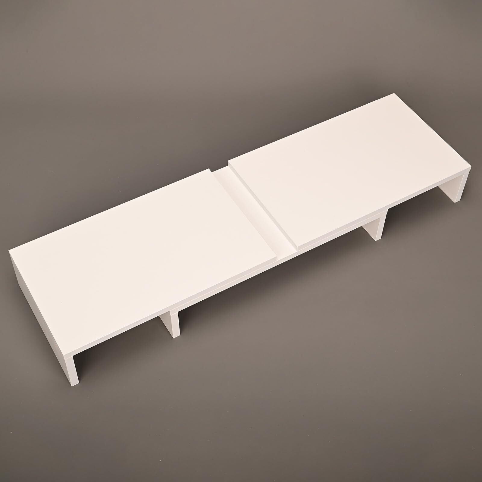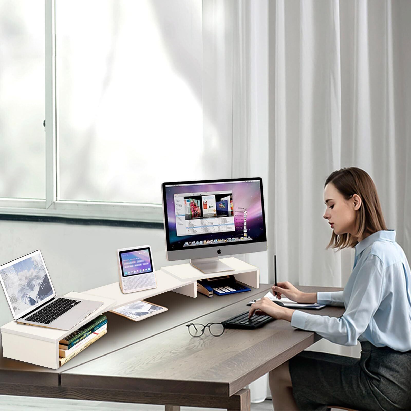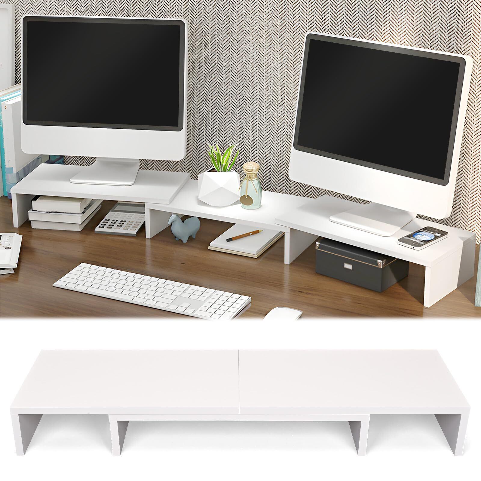 2台モニター対応PC台卓上: 2台のパソコンスタンドを同時に使用する場合は、コンピュータスタンドの両端を引っ張るだけです。パソコンを2台しか使わないときは、中央の天板にスマートフォンやタブレット、装飾品などを置くことができます