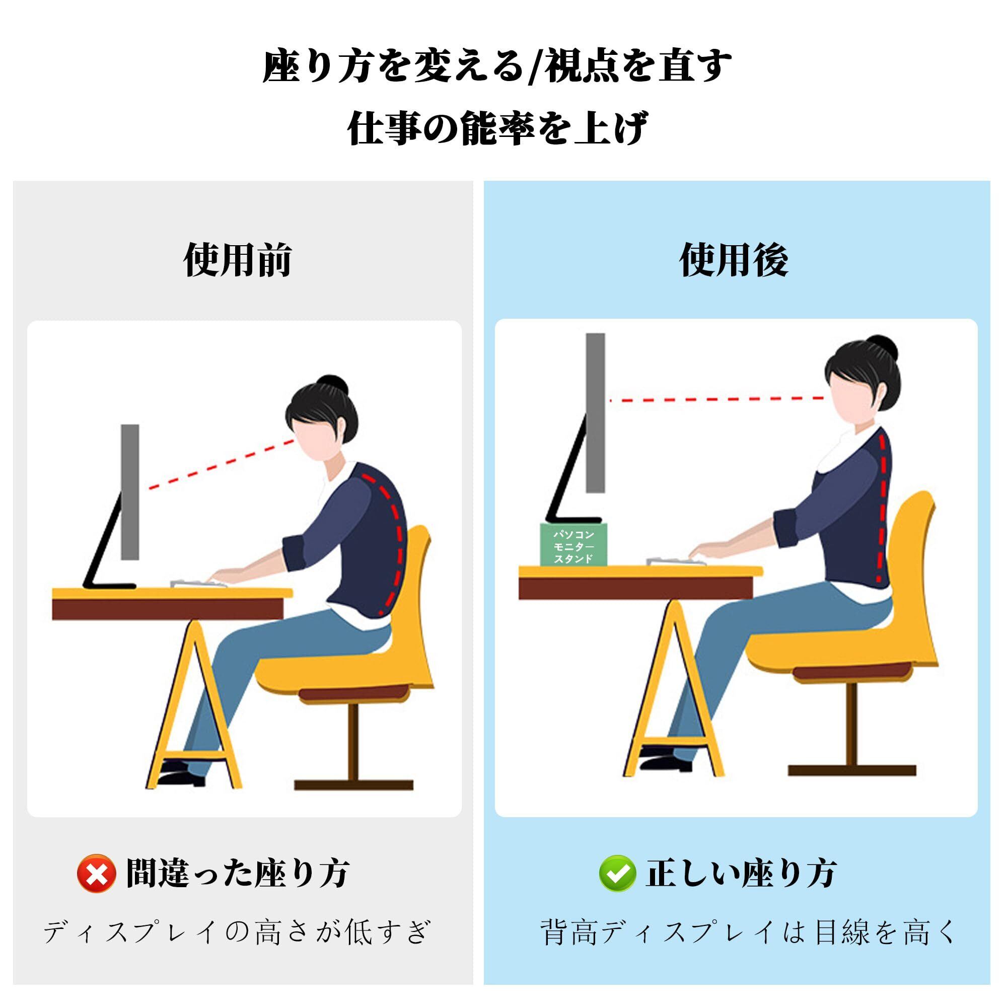 座り姿勢を変えて仕事の効率を上げる: モニターを卓上ラックの上に置くことで、視線が7.8~9cm高くなり、姿勢が正され、長時間快適に作業ができ、首や肩の負担が減り、作業効率が上がる