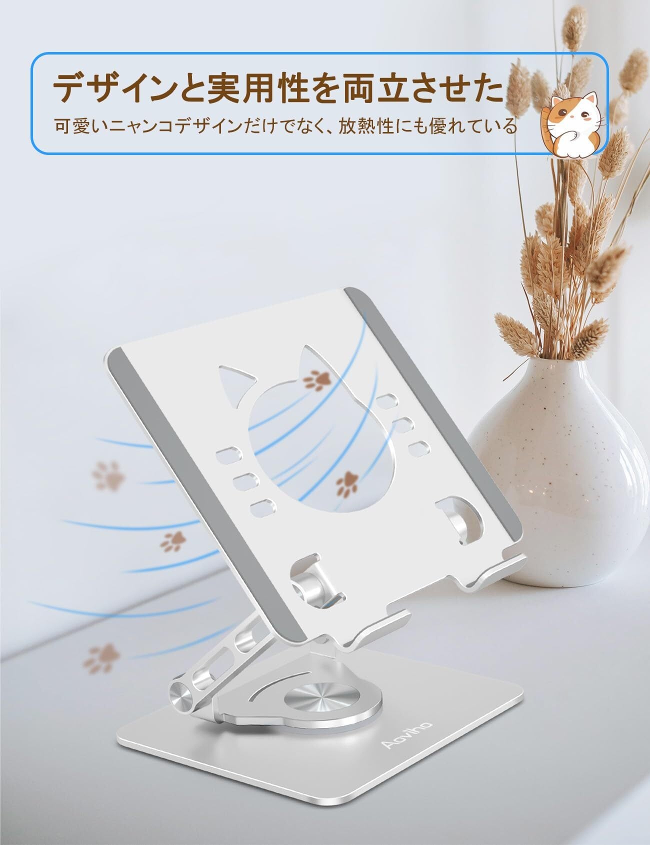 【可愛いデザイン&優れた放熱性】スタンドの天面に可愛らしいネコのデザインを施したユニークなスタンドです。ネコ好きの方に特におすすめです。また、デザイン性だけでなく、放熱性にも優れており、夏場でも安心してご使用いただけます。充電ケーブルも通せるため、充電しながら快適にデバイスを使用可能です。さらに、タブレットスタンドとしてだけでなく、ディスプレイスタンドとしても活用でき、視覚的な満足感を提供するとともに、視覚を軽減します。このスタンドは、デザイン性と実用性を兼ね備えており、日常の作業をより楽しくするお手伝いをします。