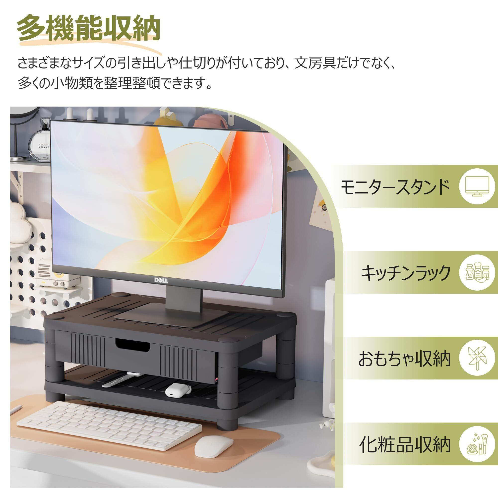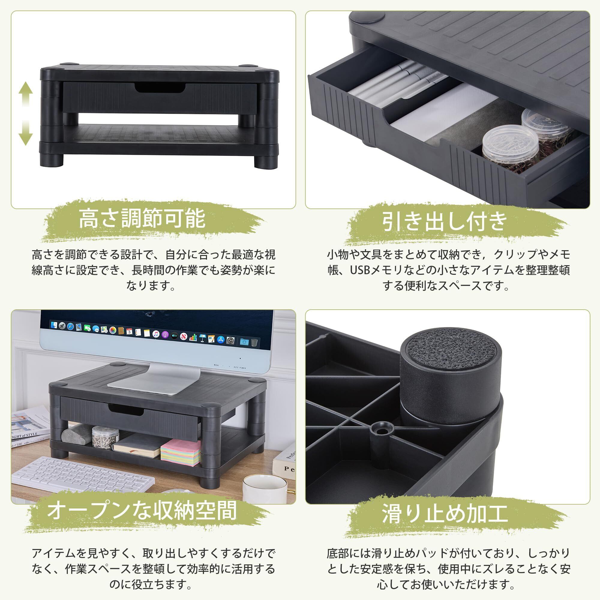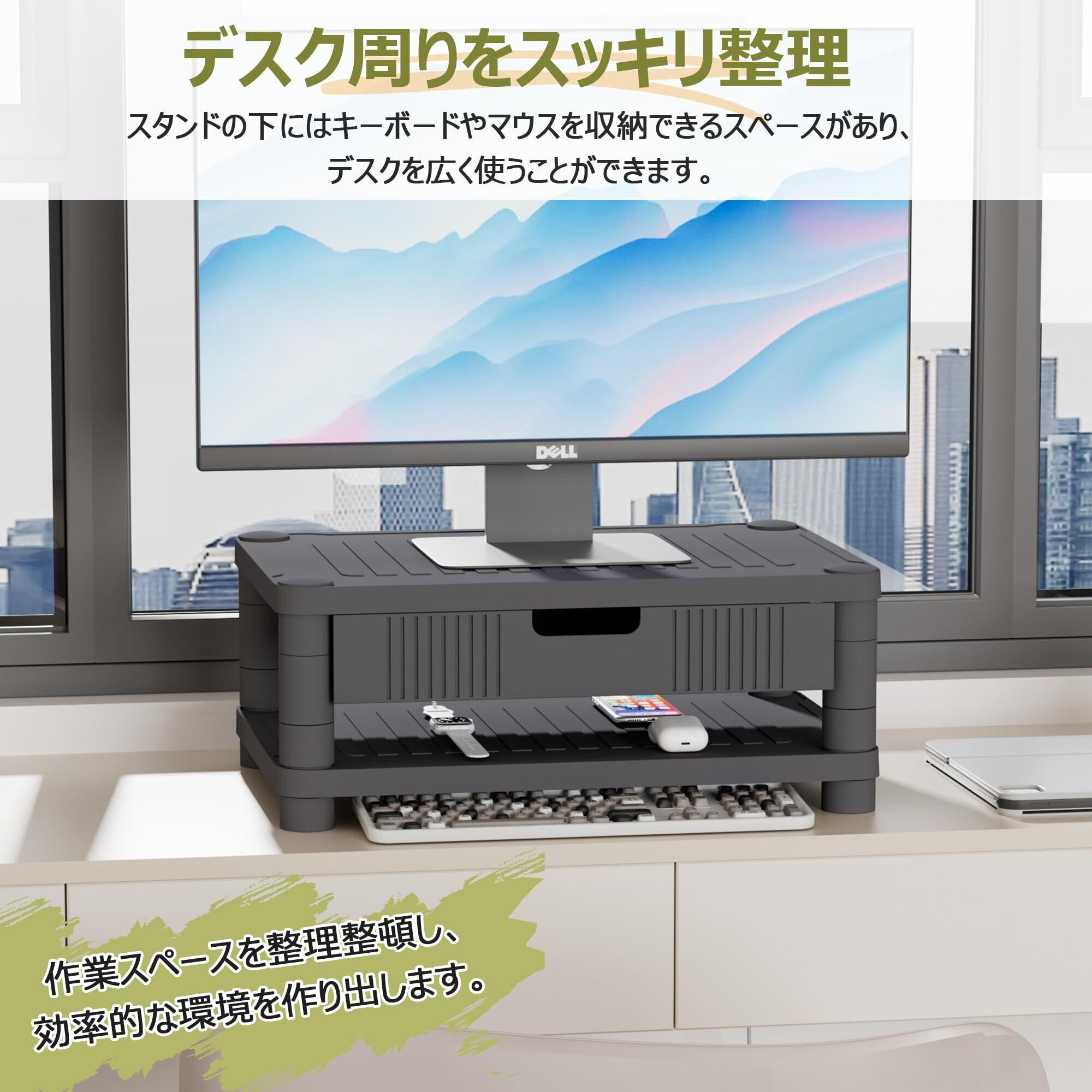 【高さ調節可能・引き出し付き】高さ調節機能を搭載しており、モニターの位置を最適な高さに調整可能。長時間の作業でも姿勢が良くなり、首や肩の負担を軽減します。引き出しが付いており、文房具やケーブル、メモ帳などをすっきり収納できます。デスク周りが整頓され、作業効率が向上します。