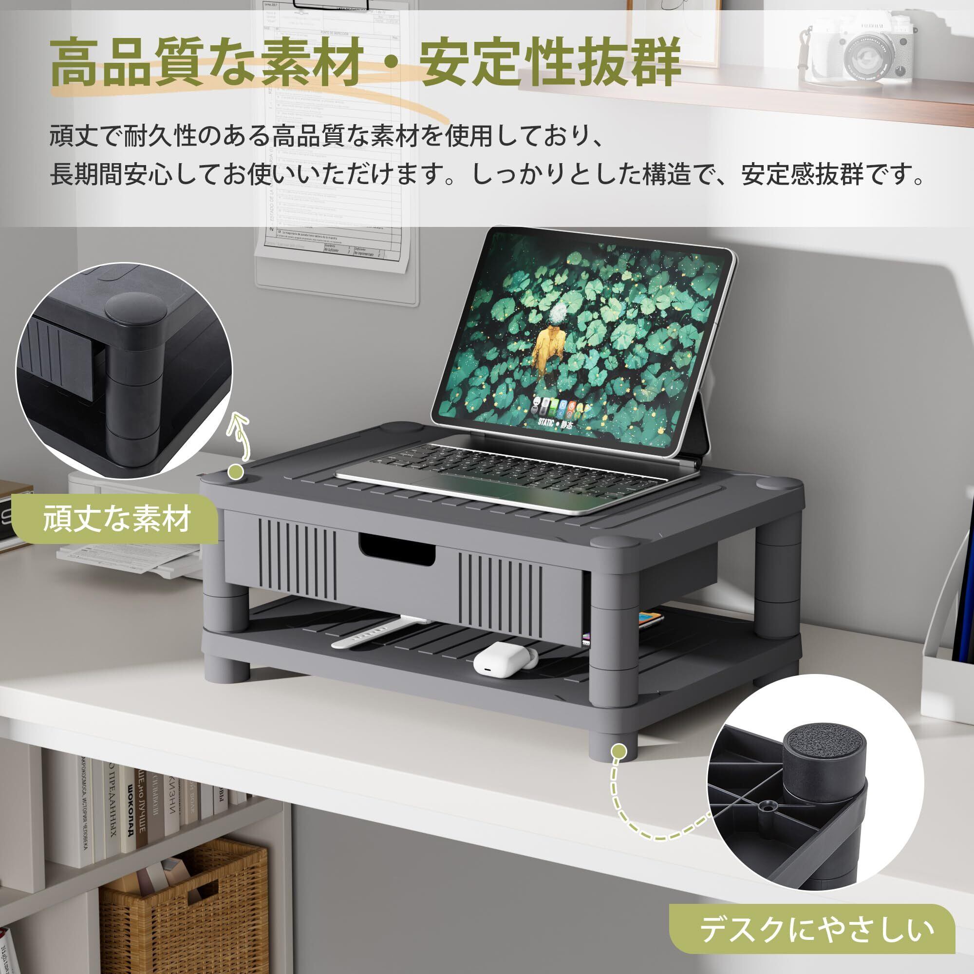 【頑丈な素材・安定感のある構造】高品質な素材を使用し、安定性が高く、重たいモニターやノートパソコンも安心して設置可能。滑り止めパッドが付いており、デスクの上でもしっかり固定されます。耐久性のある高品質な素材を使用しており、長期間使用しても色褪せず、傷がつきにくい仕様です。