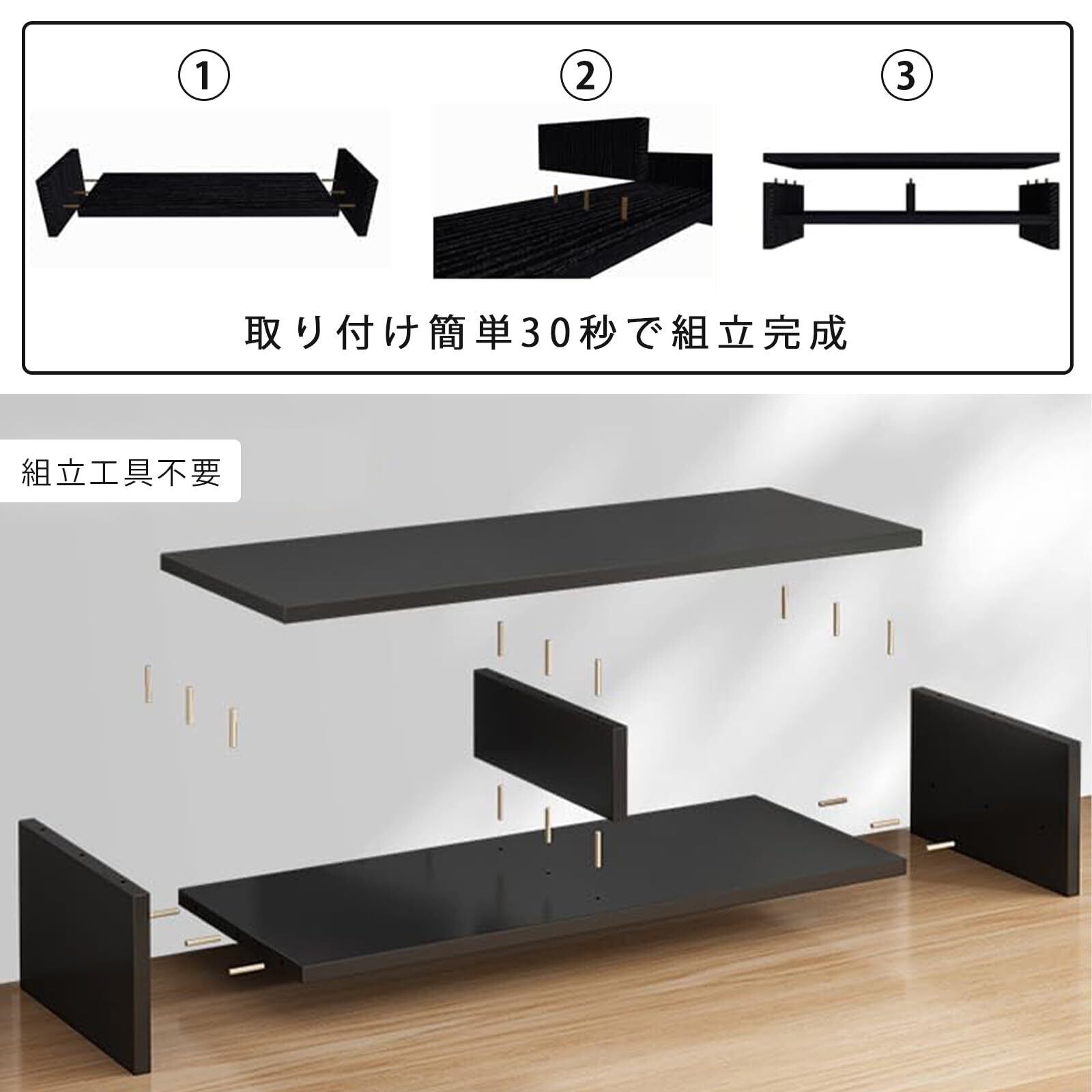 【簡単の取付方】机上台の取り付けは非常に簡単で、工具の使用は不要で、モニタースタンドの脚をネジで本体の両端の開けた穴にきつく締めれば完成になる簡単の取り付け方です。こんな素晴らしい商品をご家族や友達へのプレゼントとして喜ばせるものです。