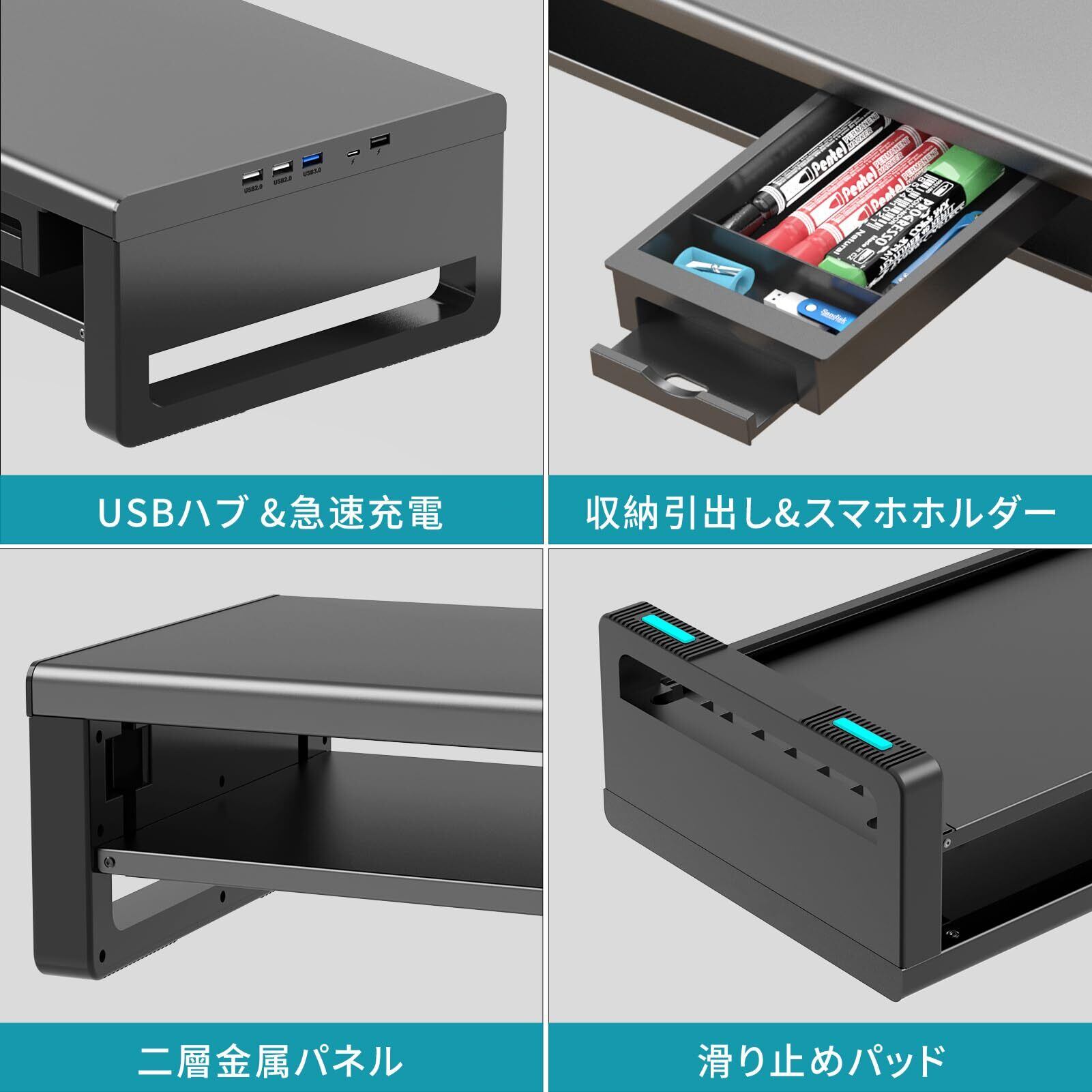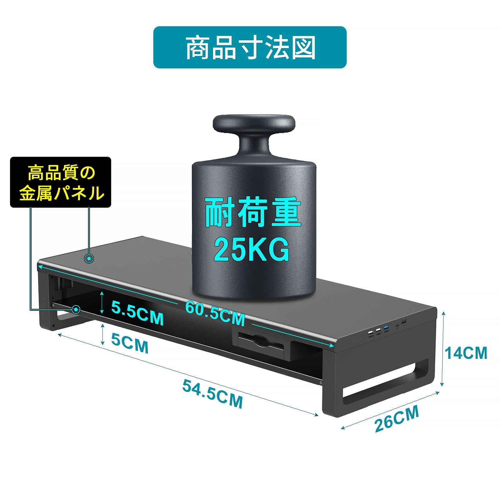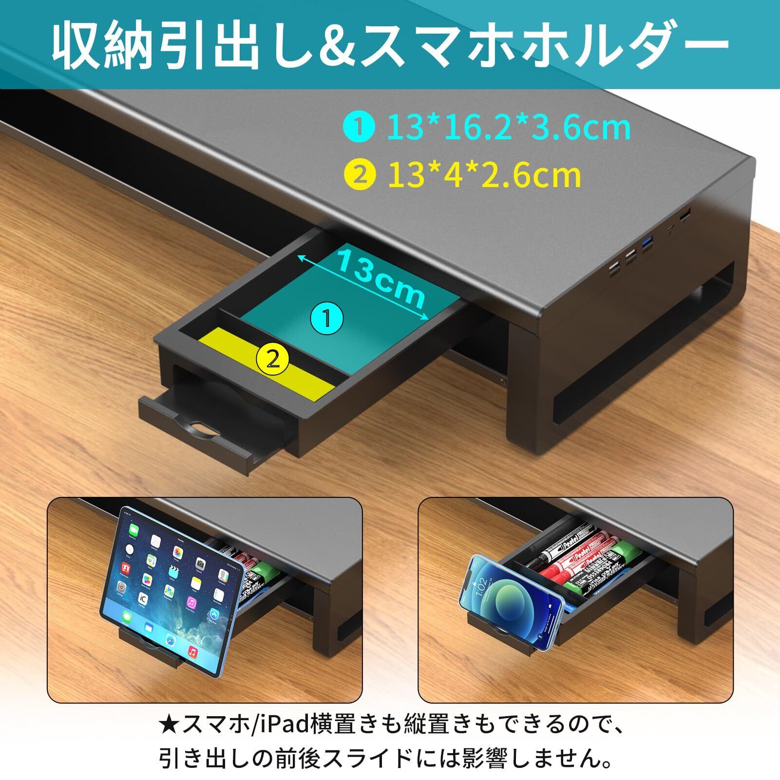 EAYHM モニター台 USB2.0/3.0データ転送付き 机上台 USB/TYPE-C充電付き モニタースタンド 引き出しとスマホホルダー付き 二段式 パソコン 台 ノートパソコン/プリンター/iMac/タブレットパソコンに適用 耐荷重25kg