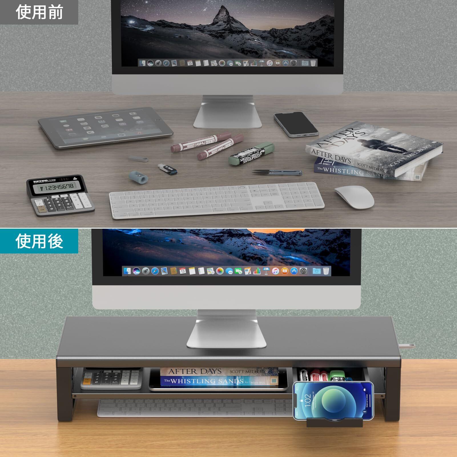 二段式の金属棚(取り外し可能):iPad、DVDレコーダー、印画紙、付箋や、ペン、ファイル、ノートPCなどをしまっておくにも便利。 モニター台の下:大きめのキーボード収納できるし、ホコリ等が溜まりにくくなります,机の上も広くなりました,空いたスペースで読書や事務作業など、デスクを広く快適に使えます。きちんとした作業スペースをお楽しみください!