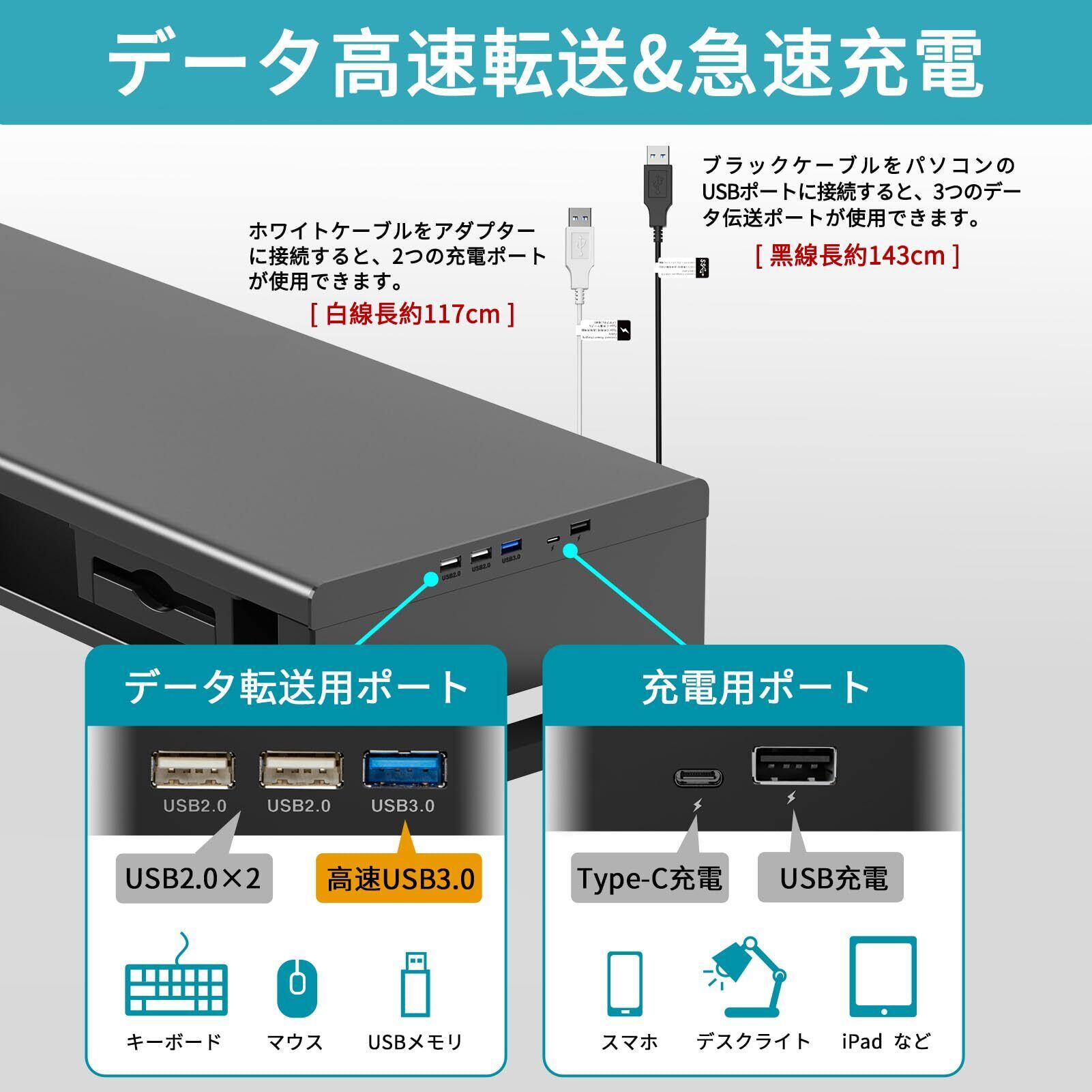 3つのUSBポートと2つの充電ポート:EAYHM ディスプレイ 台には、1つのUSB3.0ポートと2つのUSB2.0ポートがあります。 USBケーブル(贈り品)をパソコンに接続すると、ハブの拡張機能を使用できます。 マウス、キーボード、USBメモリを接続できます。 また、TYPE-CとUSB充電ポートも一つずつ付属し、急速充電ケーブル(贈り品)を充電ポートに接続することで、急速充電をお楽しみいただけます!