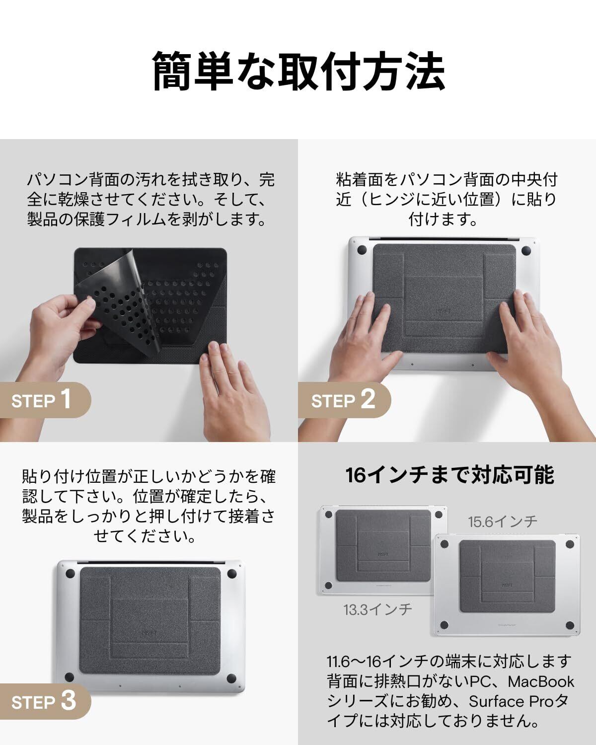 【極めた軽さ・幅広いに対応】重さ僅か89g、厚さも3mmとなっています。マグネット内蔵設計で、スタンドを収納する時はパソコンの下に隠れることができ、存在感が極めて薄くなります。一方で、立てるときは速くてスマートになり、一度使うと忘れ難いパソコンスタンドです。最大15.6インチまでに対応、底穴付きの放熱対策も採用しています。Macbook Pro/Air/タブレットはもちろん、他の平底ノートPCにも対応するので、MOFTスタンドを是非一度試してください!