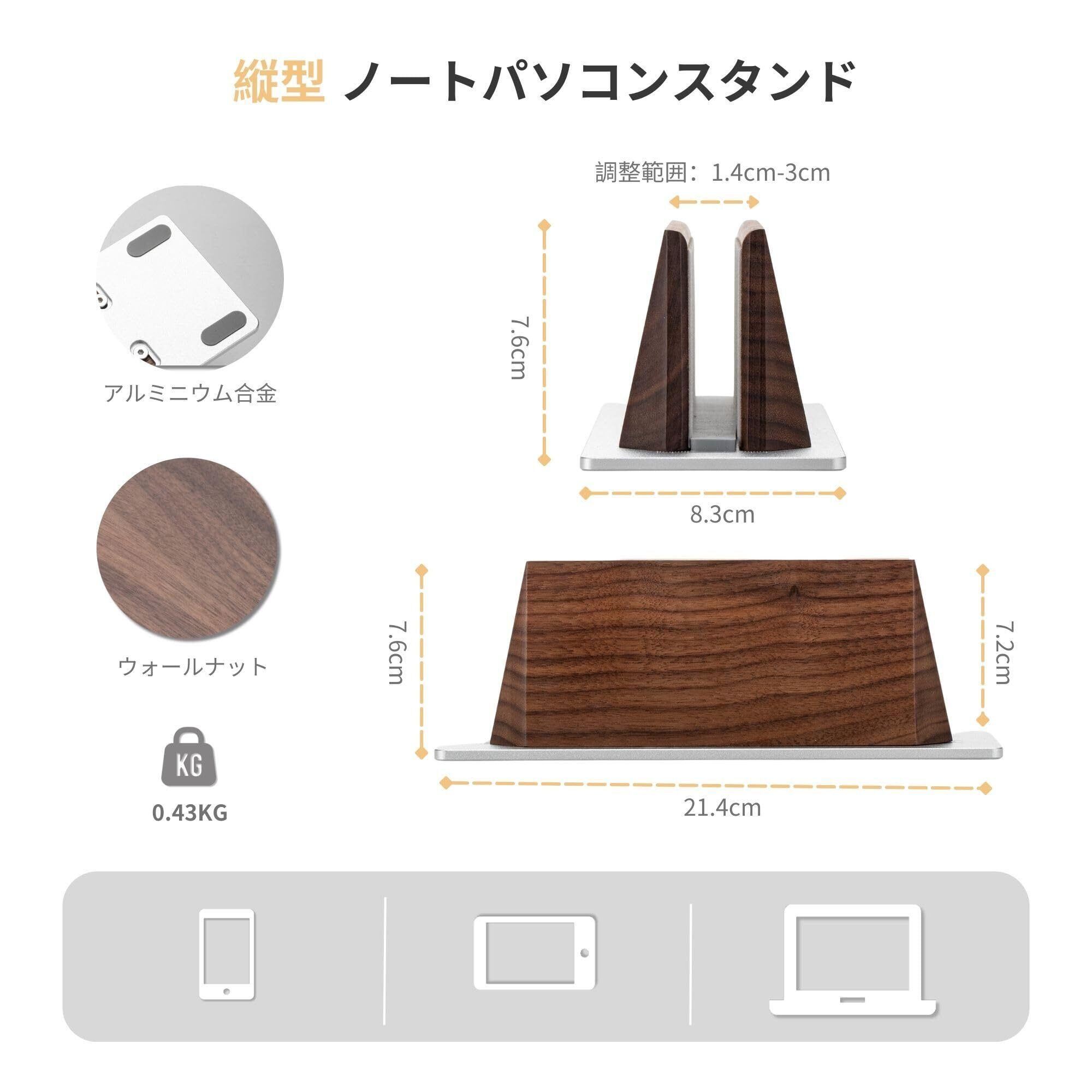 Muso Wood ノートパソコンスタンド 縦型 pcスタンド 縦置き 幅調節可能 収納 パソコン台 卓上 ラップトップスタンド 滑り止め 安定性 全機種対応 (アルミ合金製+ウォールナット)