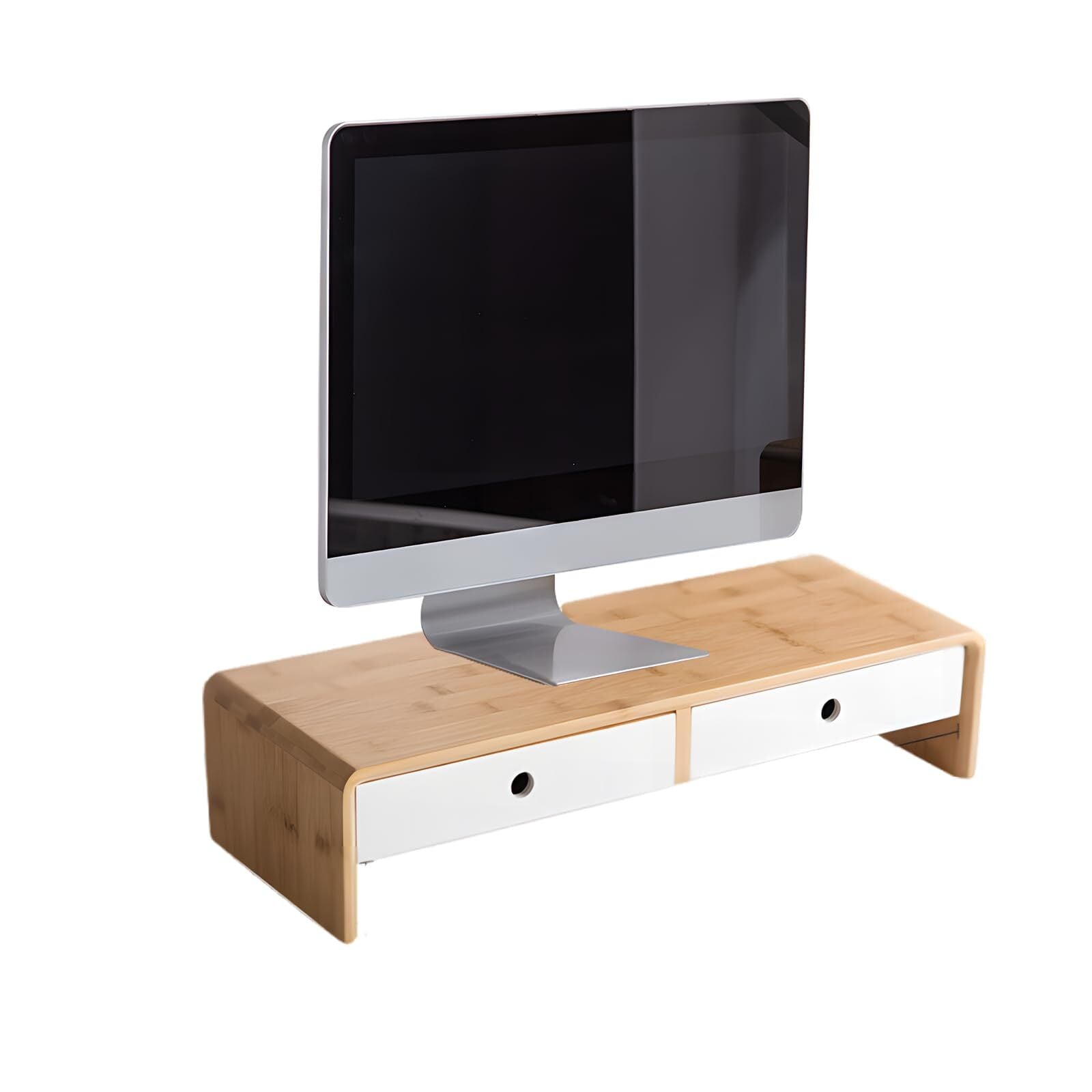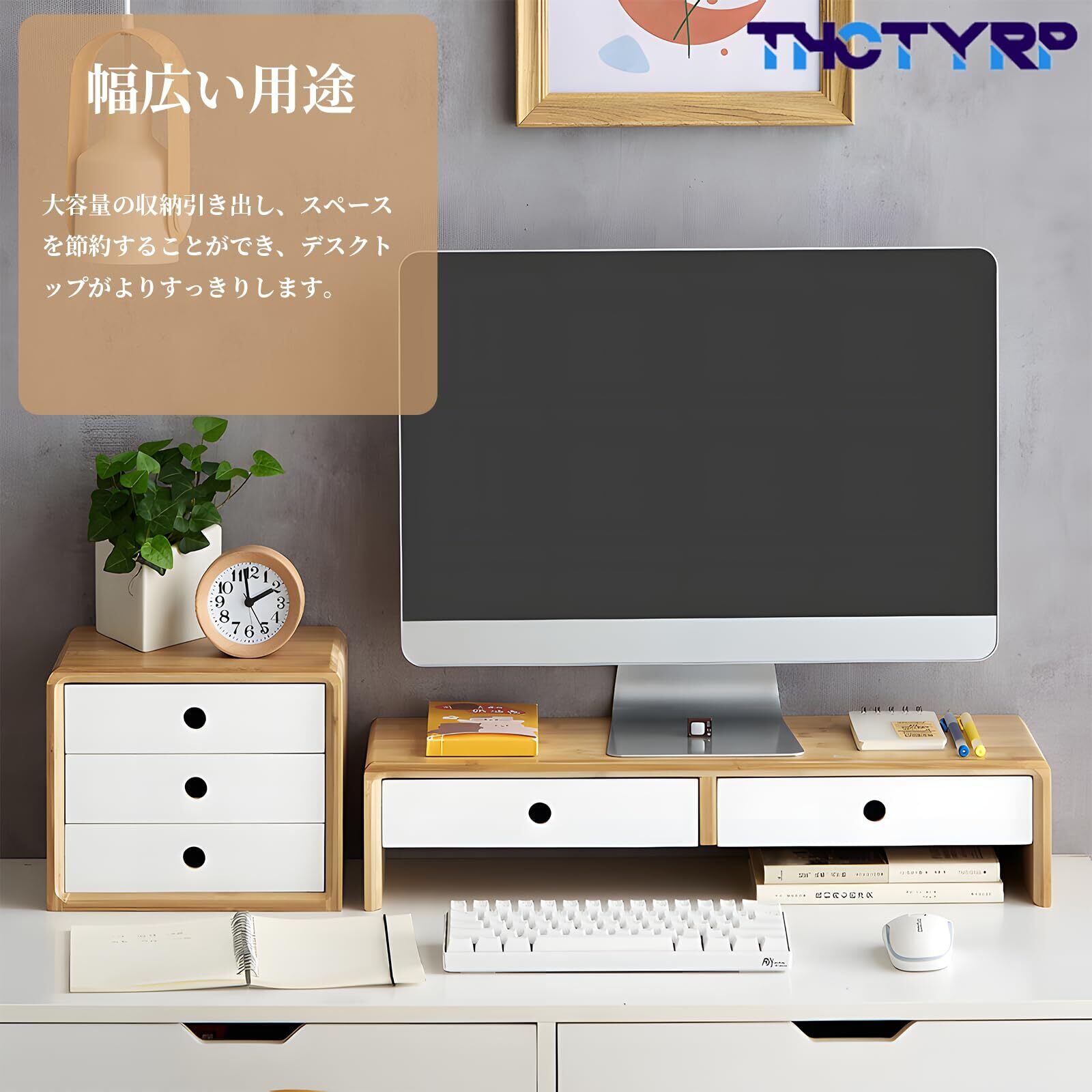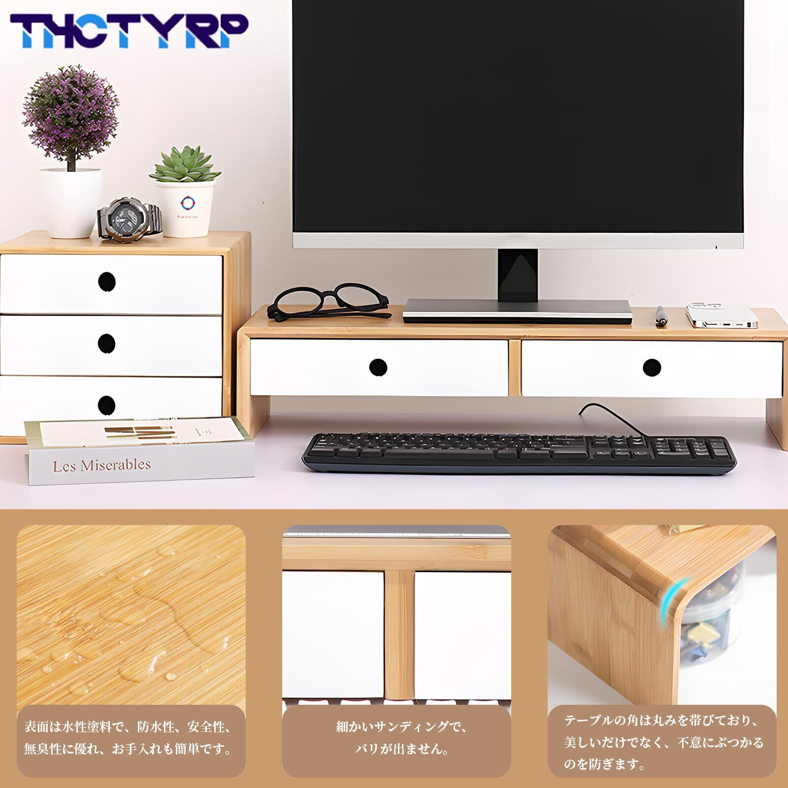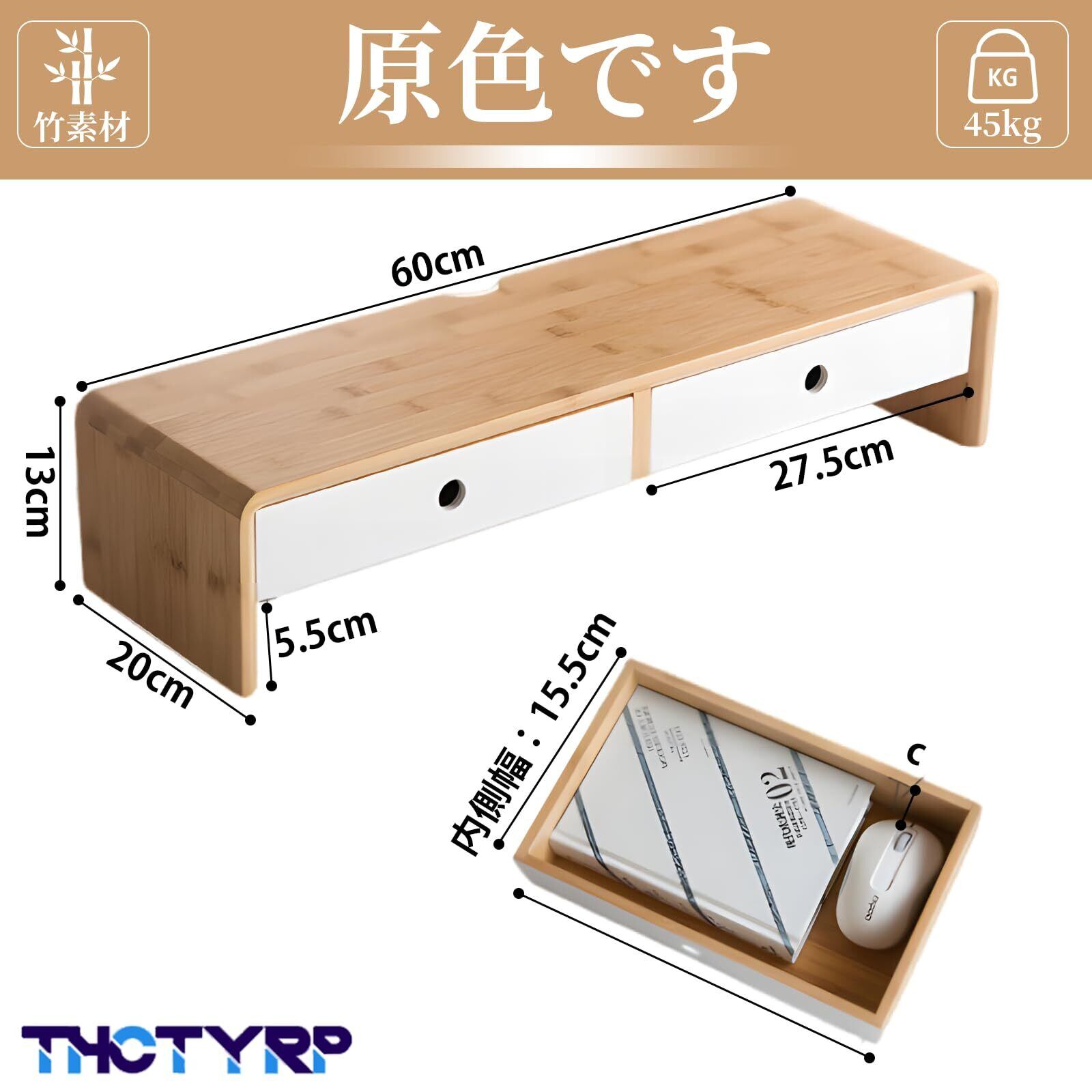THCTYRPモニター台、机上ラック 2段、組み立て不要 幅60x奥行き30x高さ13cm デスク上置棚 引き出し付き パソコン台 pc台 机上 収納 引き出し 長さ26×幅15.5cm 高さ5.2cm 竹製 植物オイル塗装仕上げ 耐荷重20kg(混合白)