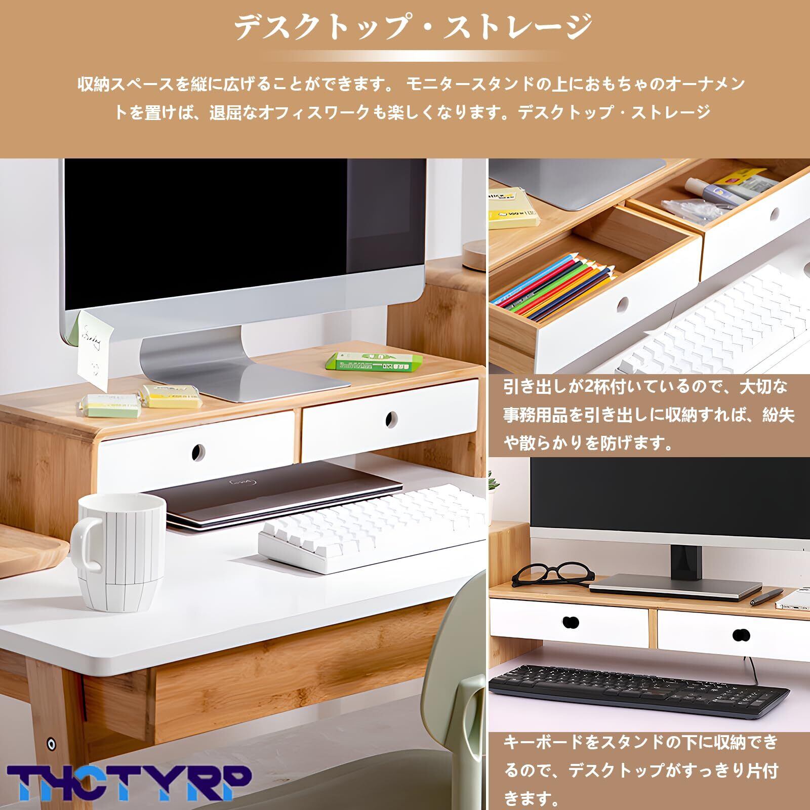 【幅広い用途】モニタースタンドパソコンスタンド、デスク収納、テレビキャビネットなどの機能として使用できます。リビングルーム、ベッドルーム、書斎のどこに置いても、そのナチュラルでフレッシュな色はいつでもお部屋を飾ることができます。大容量の収納引き出しにより、スペースを節約し、デスクトップをより整頓できます。
