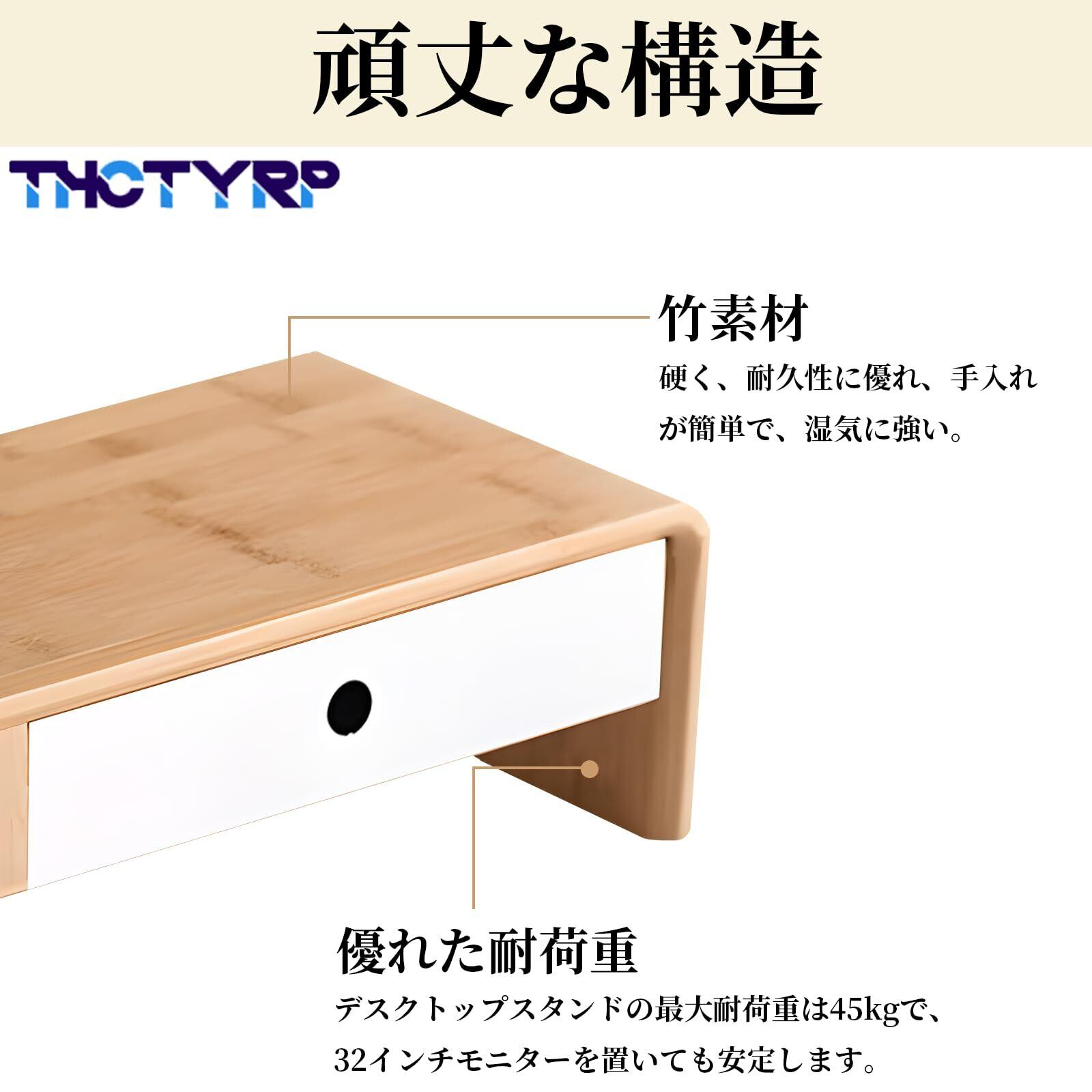 【頑丈な構造】モニタースタンドの脚と天板は安定した頑丈な構造で、パネルを安定して支えます。モニタースタンドのボードは竹素材で作られており、丈夫で耐久性があります。デスクトップスタンドの耐荷重は45kgで、32インチモニターを置いても安定します。