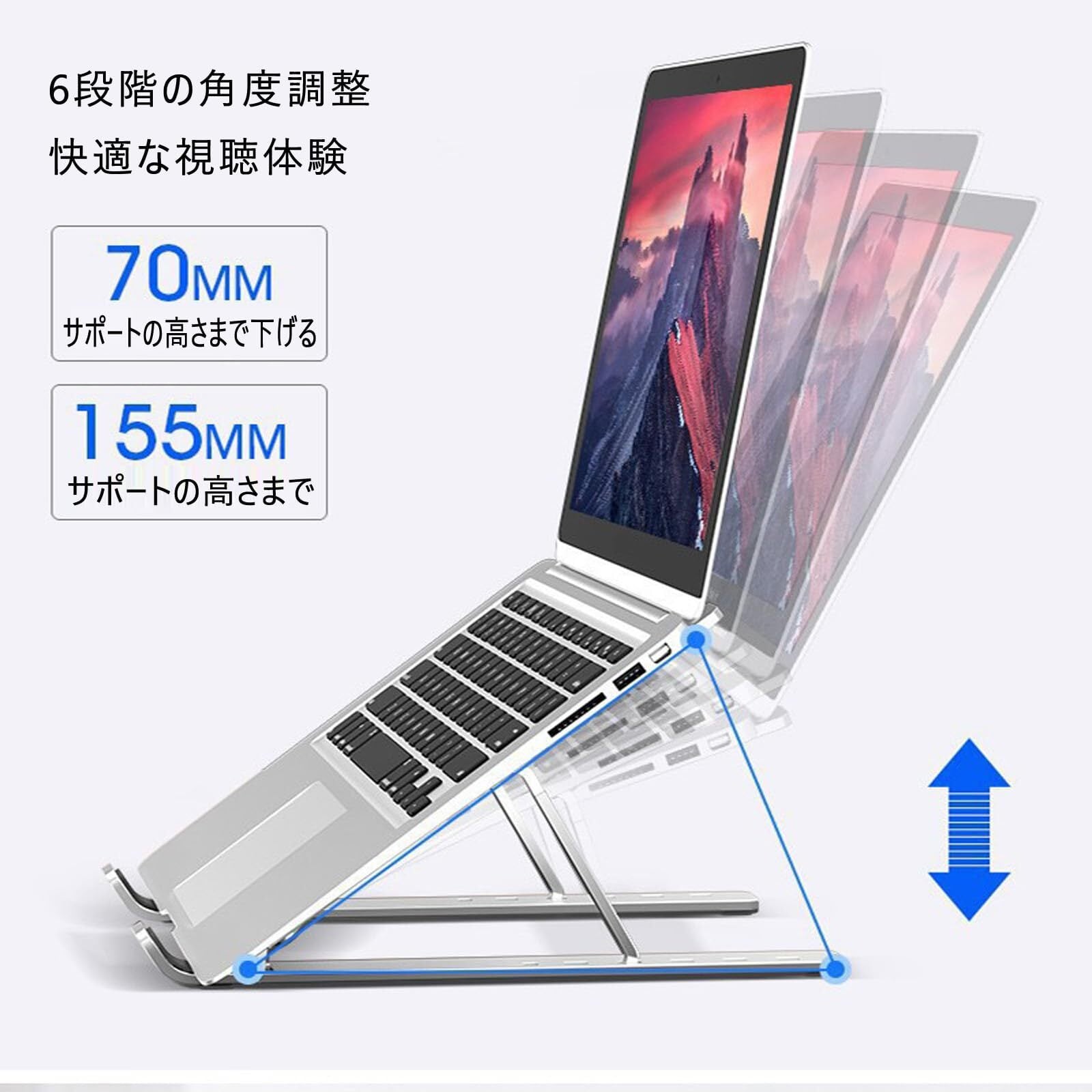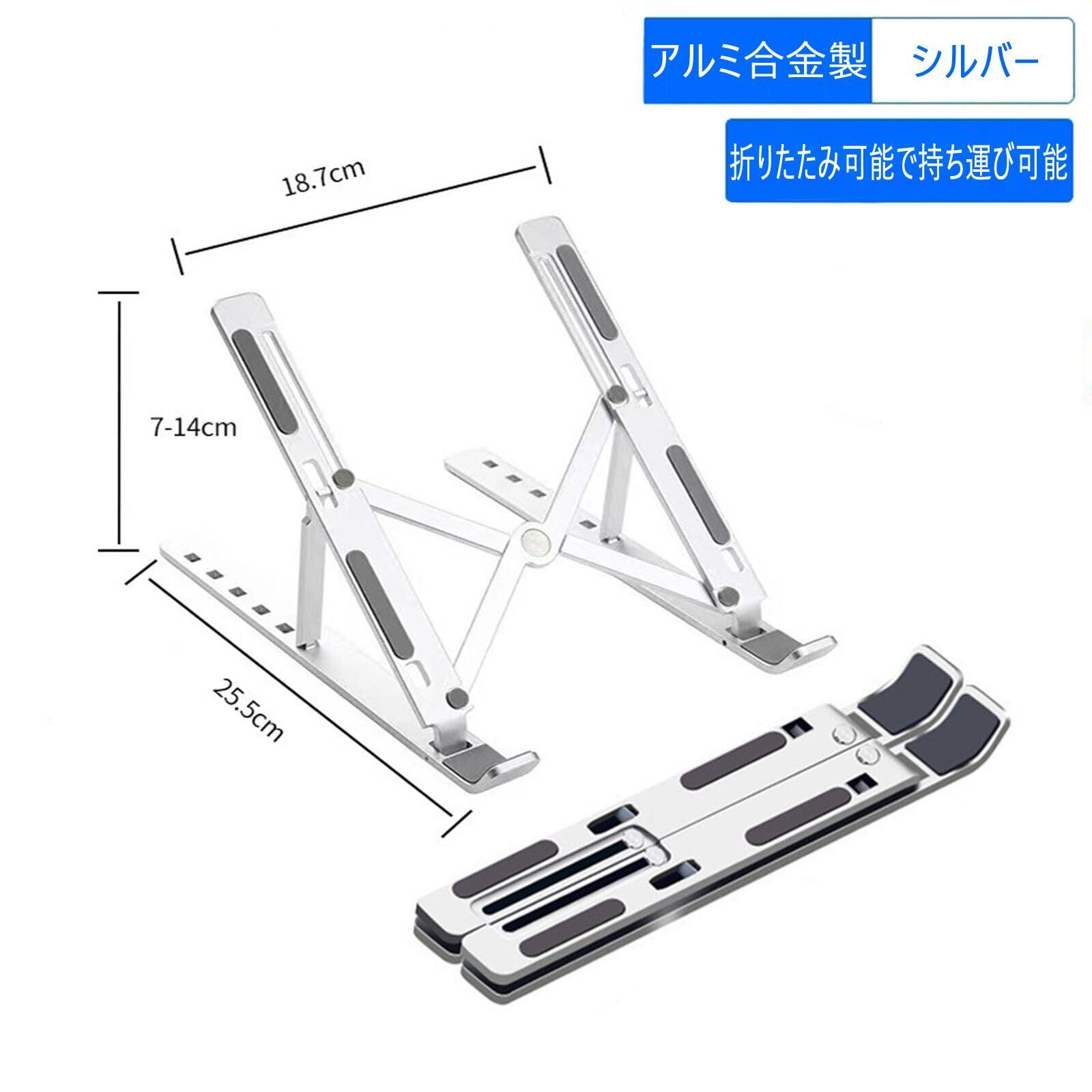 特徴 サイズ: 25.5cmx18.7cmx(7-15.5)cm 材質:アルミニウム合金 高さ調節可能:6段階 放熱設計: 中空底板 サポート構造: 三角形サポート設計 製品説明 このラップトップスタンドは6段階に高さを自由に調整できるため、仕事、勉強、娯楽のいずれでも最も快適な角度を見つけることができます。 アルミニウム合金製で、頑丈で耐久性があります。 三角形のサポート設計により、形状がより安定し、揺れを防ぎます。折りたたみ式で持ち運びが簡単で、スペースを取りません。 新しい仕事と学習の方法をより快適かつ便利にします。