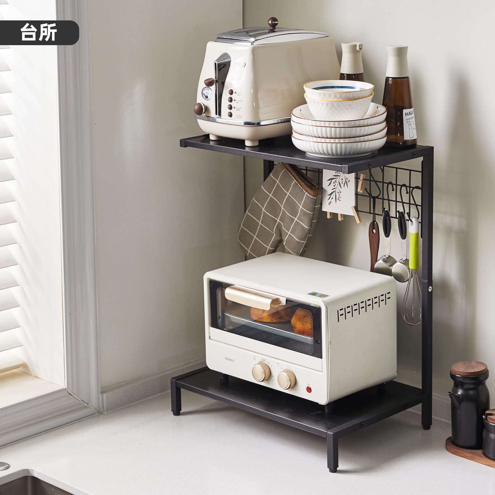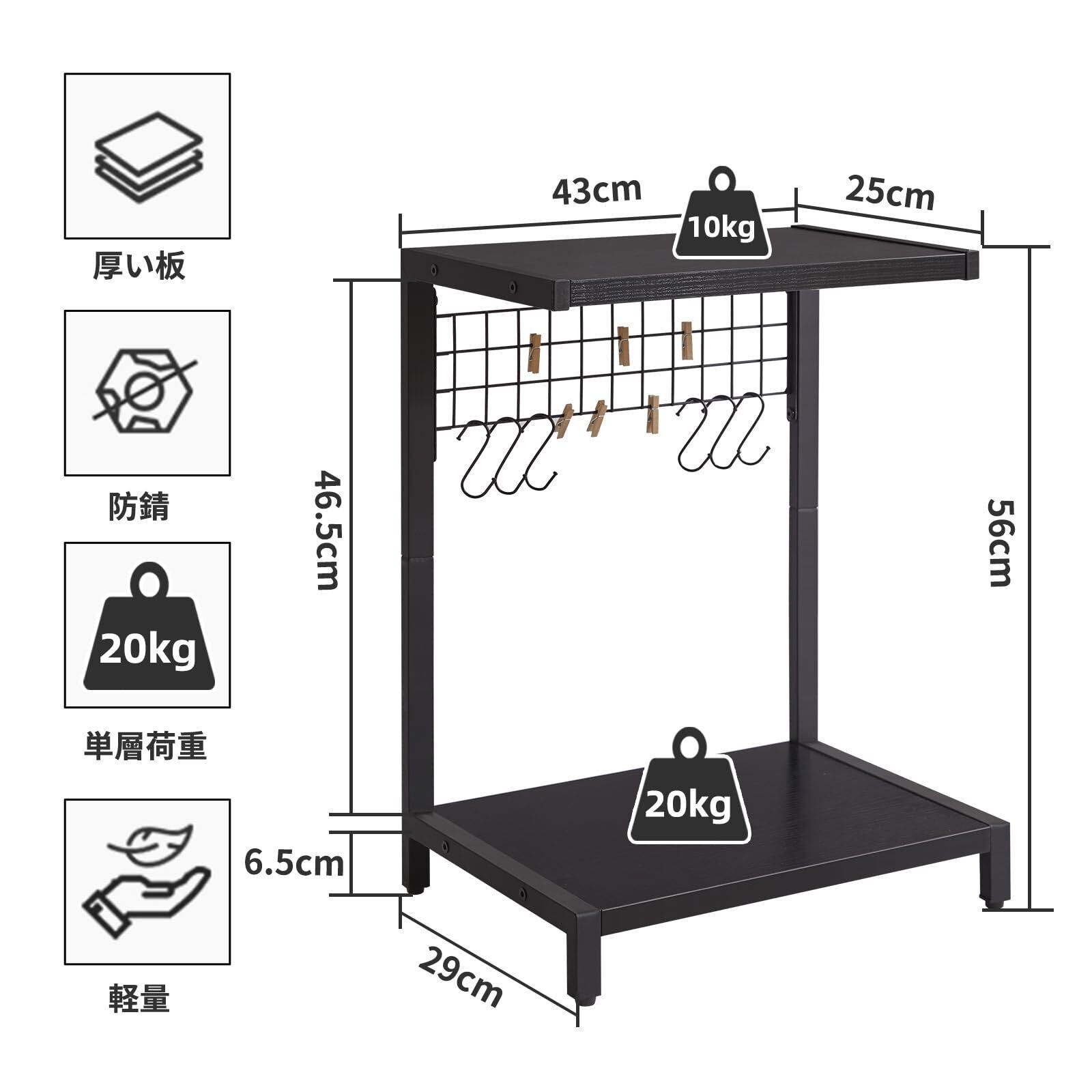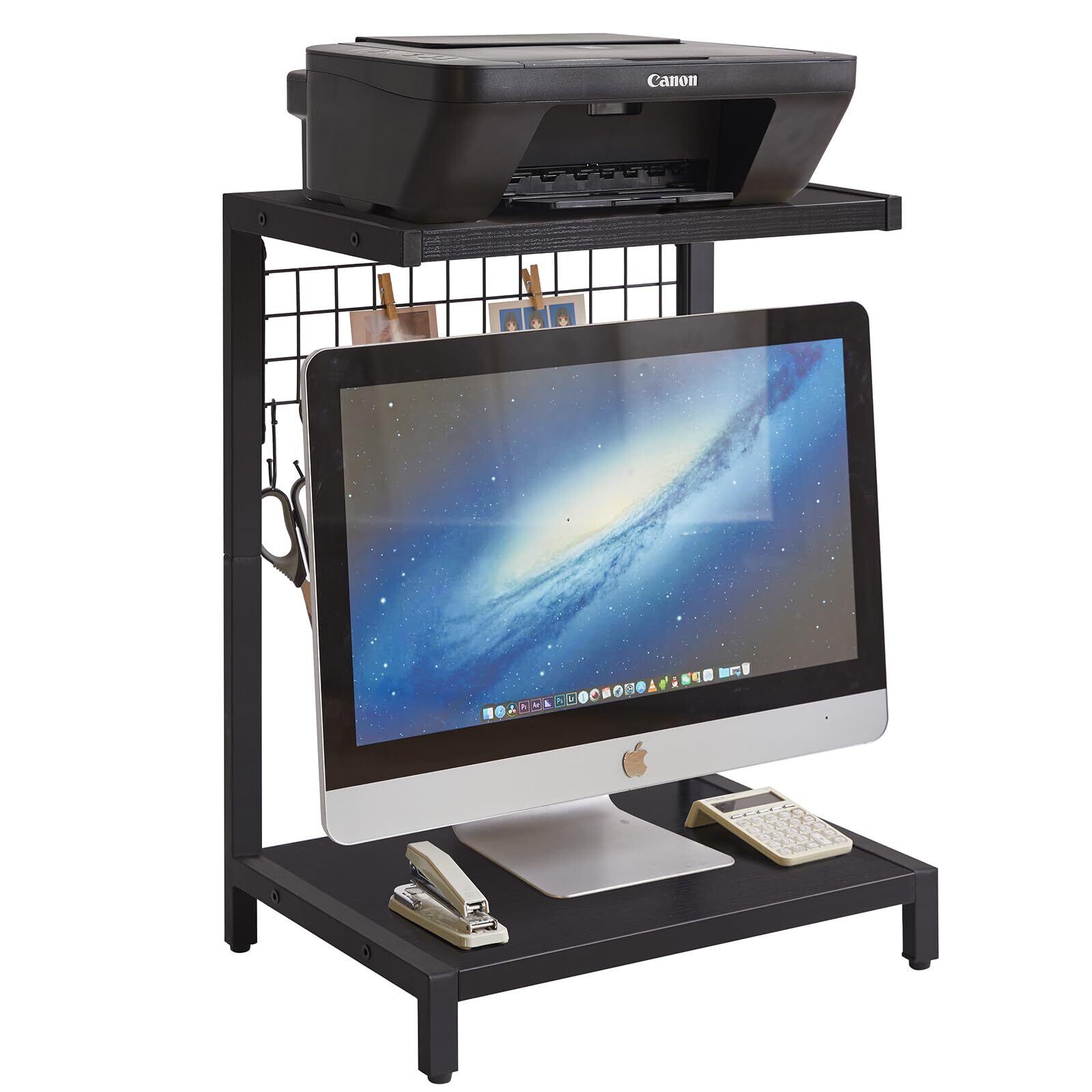 Aibiju モニター台 卓上 デスクシェルフ 43*25/29*55cm パソコン台 スタンド キーボード 収納 2段 プリンター台 レンジラック フックやクリップとペグボード付き 黒 YD-DSR003B