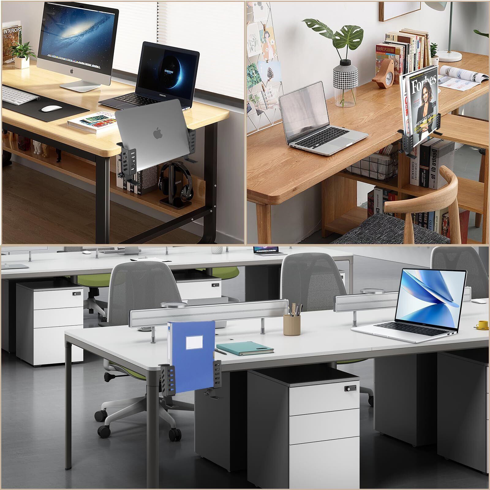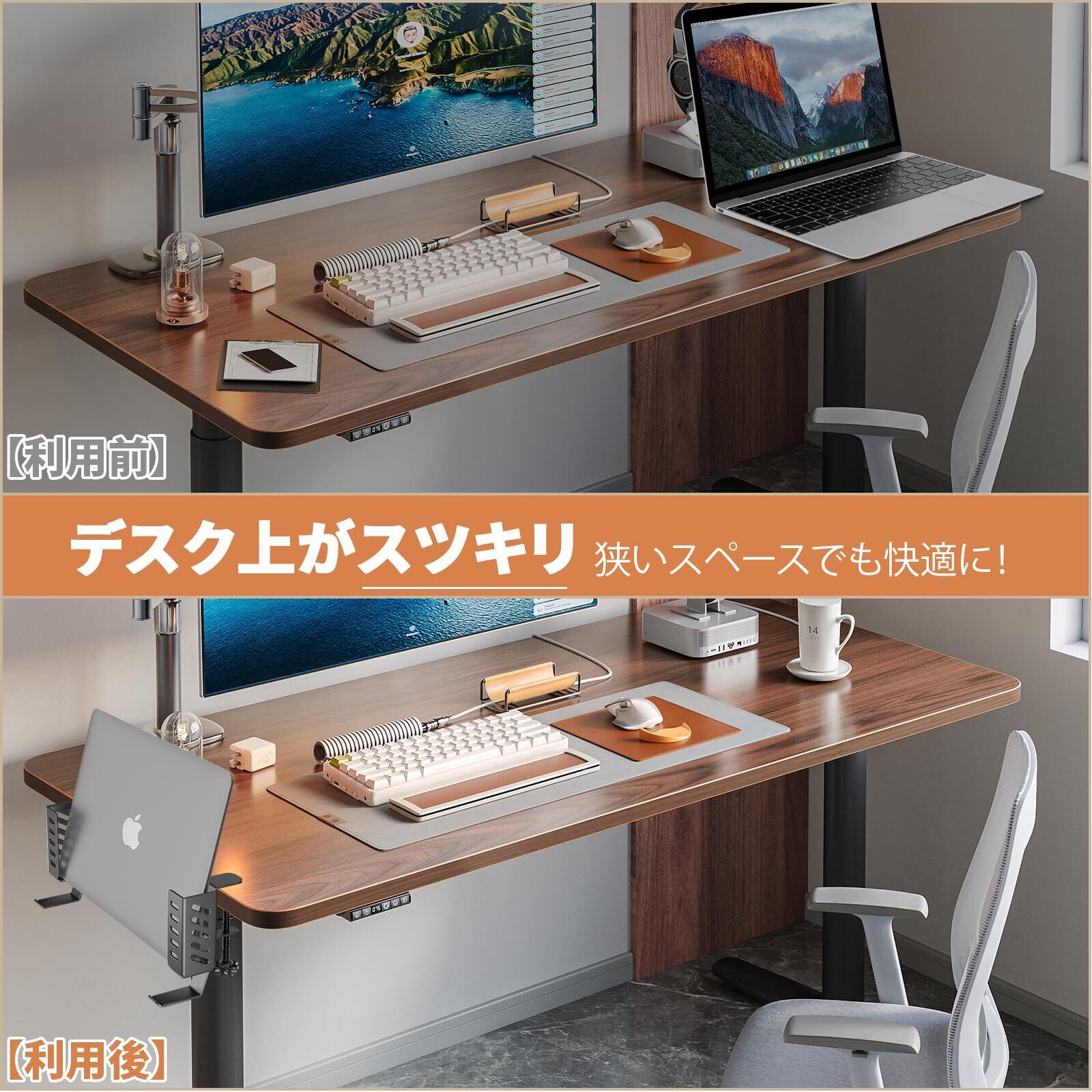 【フック付き・デスク周り 収納】 この ノートパソコンスタンド はフック付き、ノートパソコン、タブレット、Switchゲーム機、書類などを置きつつ、ヘッドセット、バックパックや小物などを引っ掛けて使うことができます。更にスチール製&スリッドなのでデバイスの排熱も良く、マグネットフックやケーブルクリップなどを取り付けることもできます。