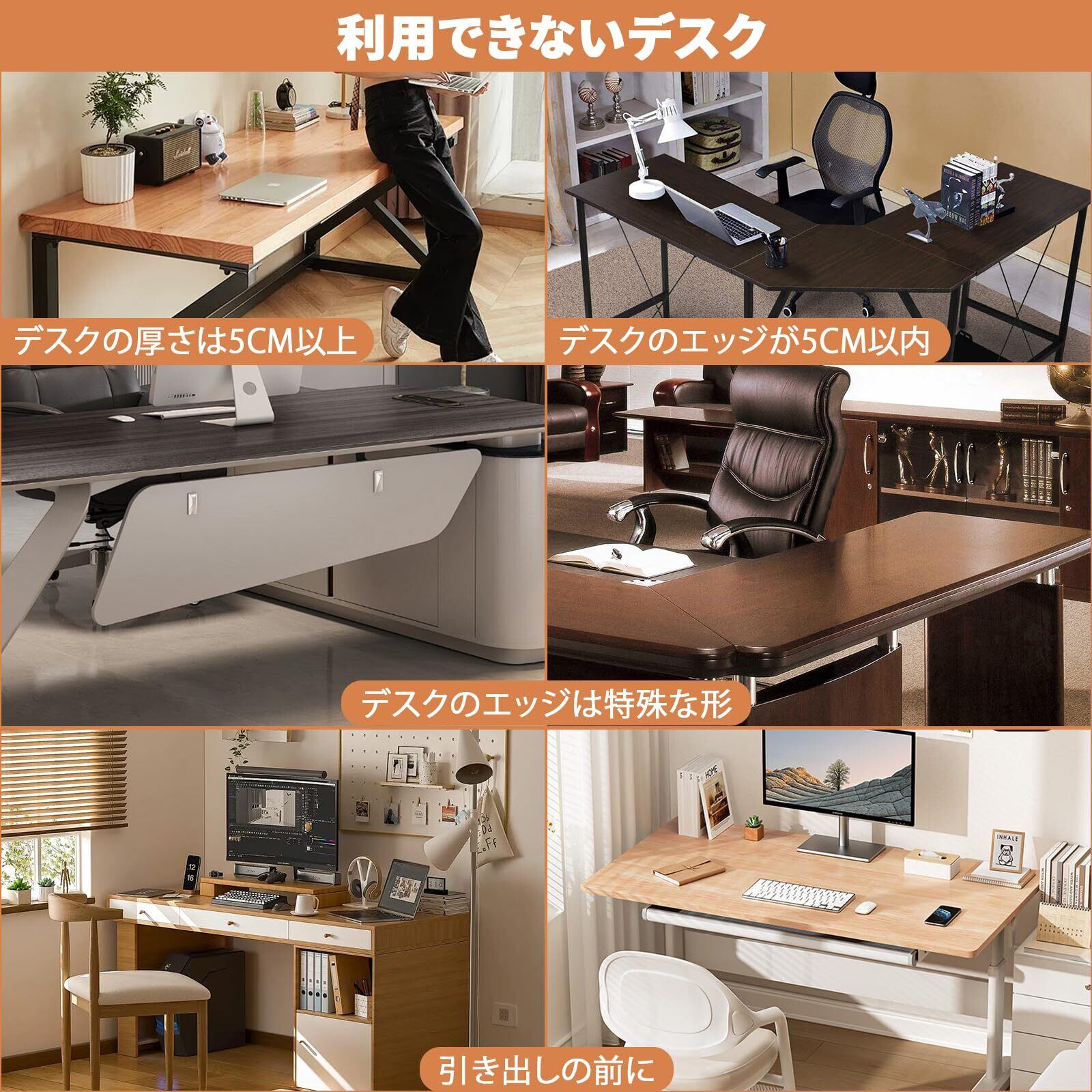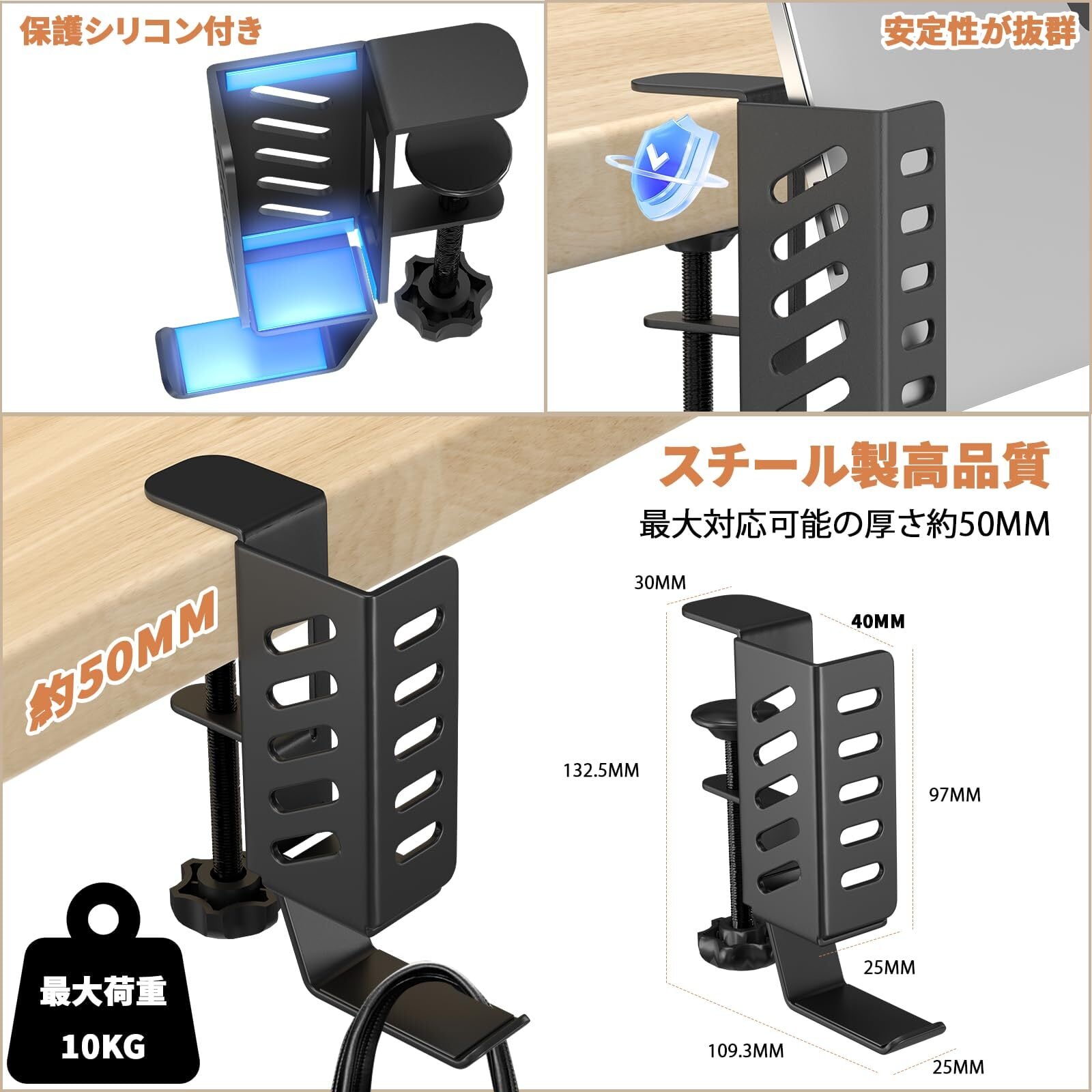 【穴あけ不要・クランプ式】 デスクを傷つけないクランプ式なので、デスクの厚さなどに応じて幅を調整し、釘などの工具を使用する必要がなく、このデスク収納スタンドを簡単に取り付けることができます。5cmまでの天板の厚さに対応可能です。滑り止めシートで、つくえにも、収納ものにも、落下を防ぎ、傷をつけることなく、しっかり固定できます。