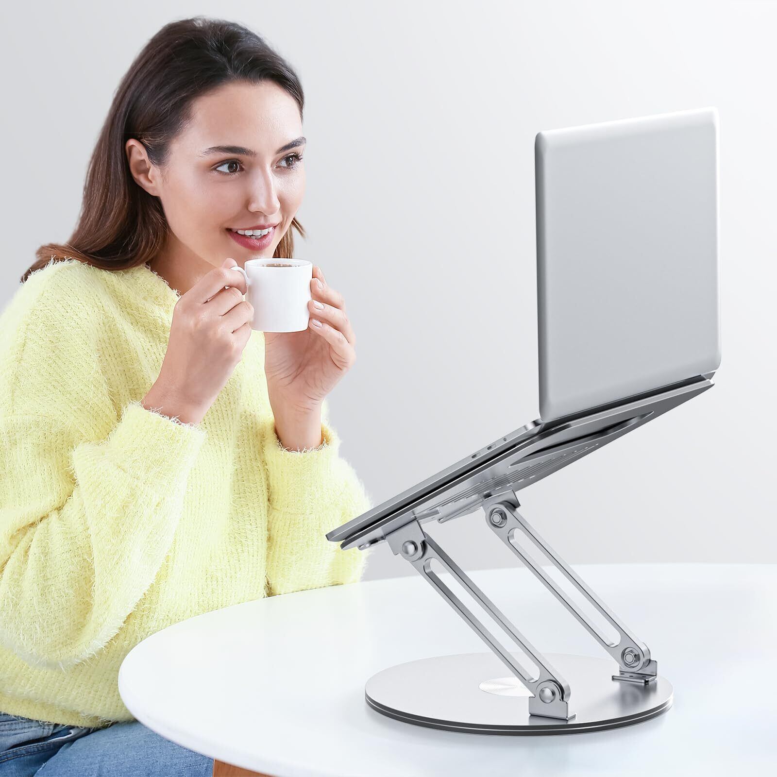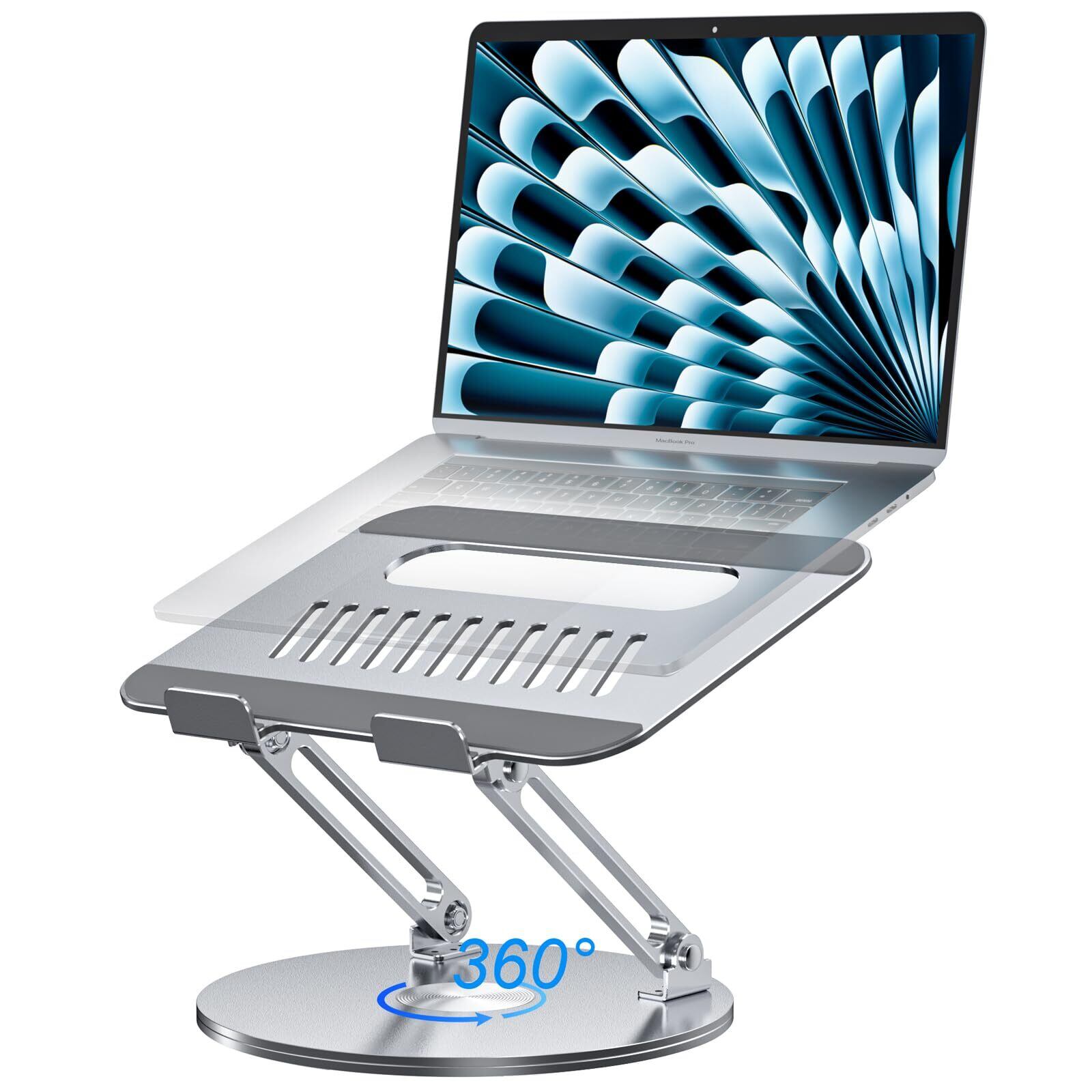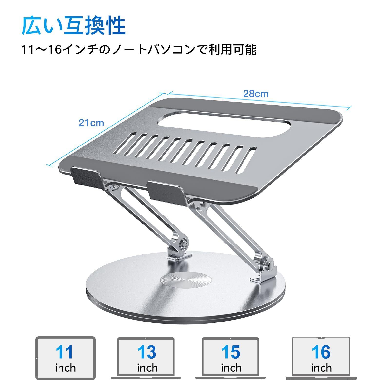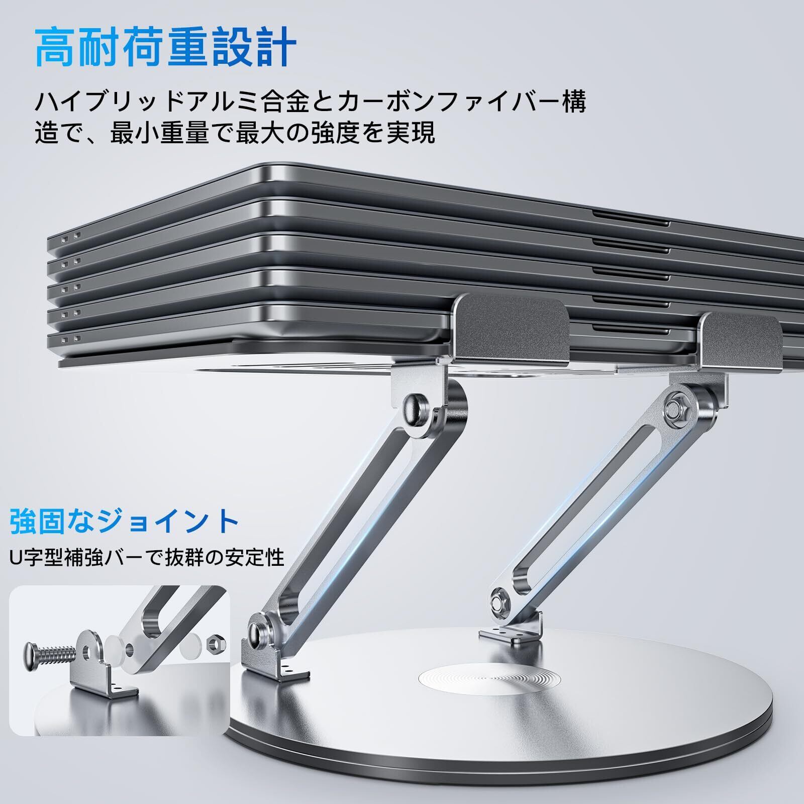 【 360°回転ベースで視界自由】ノートパソコンスタンド底面が 360°自由に回転 するため、画面の向きを簡単に調整可能!同僚との情報共有やオンライン会議、プレゼンテーション、ライブ配信など、様々なシーンで大活躍。スムーズな画面移動で、作業のストレスを軽減します!