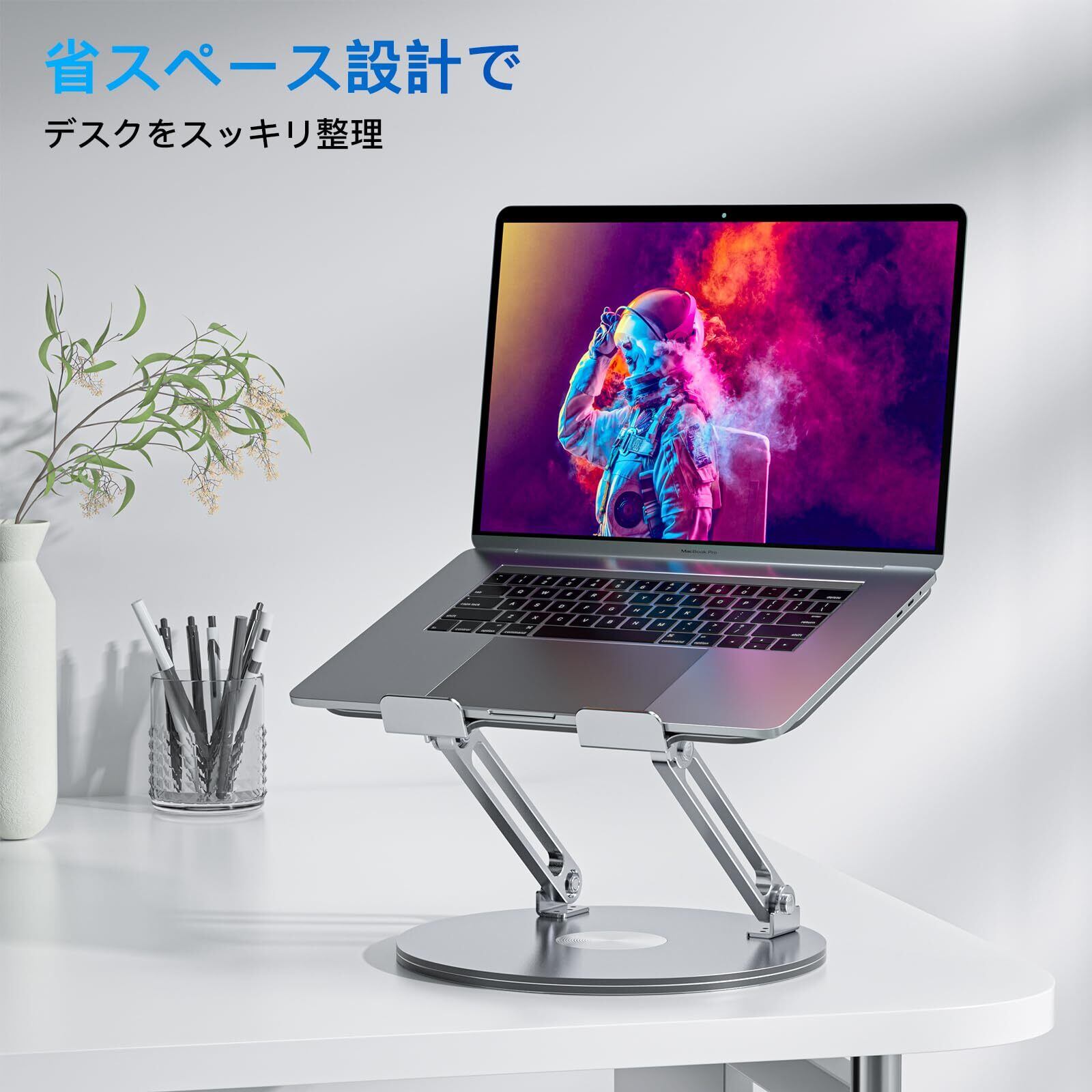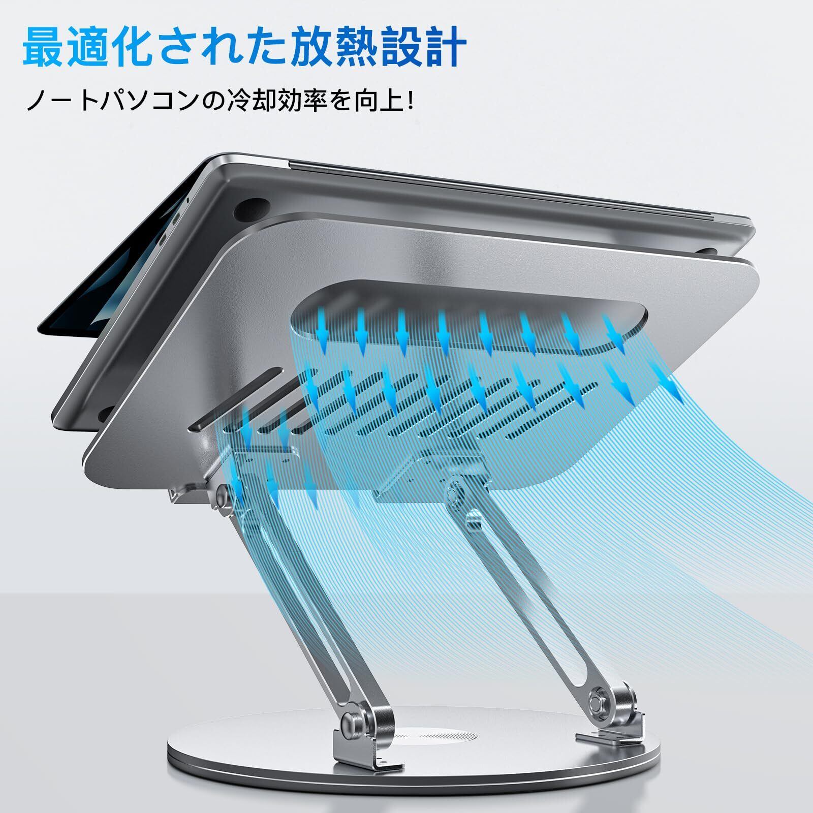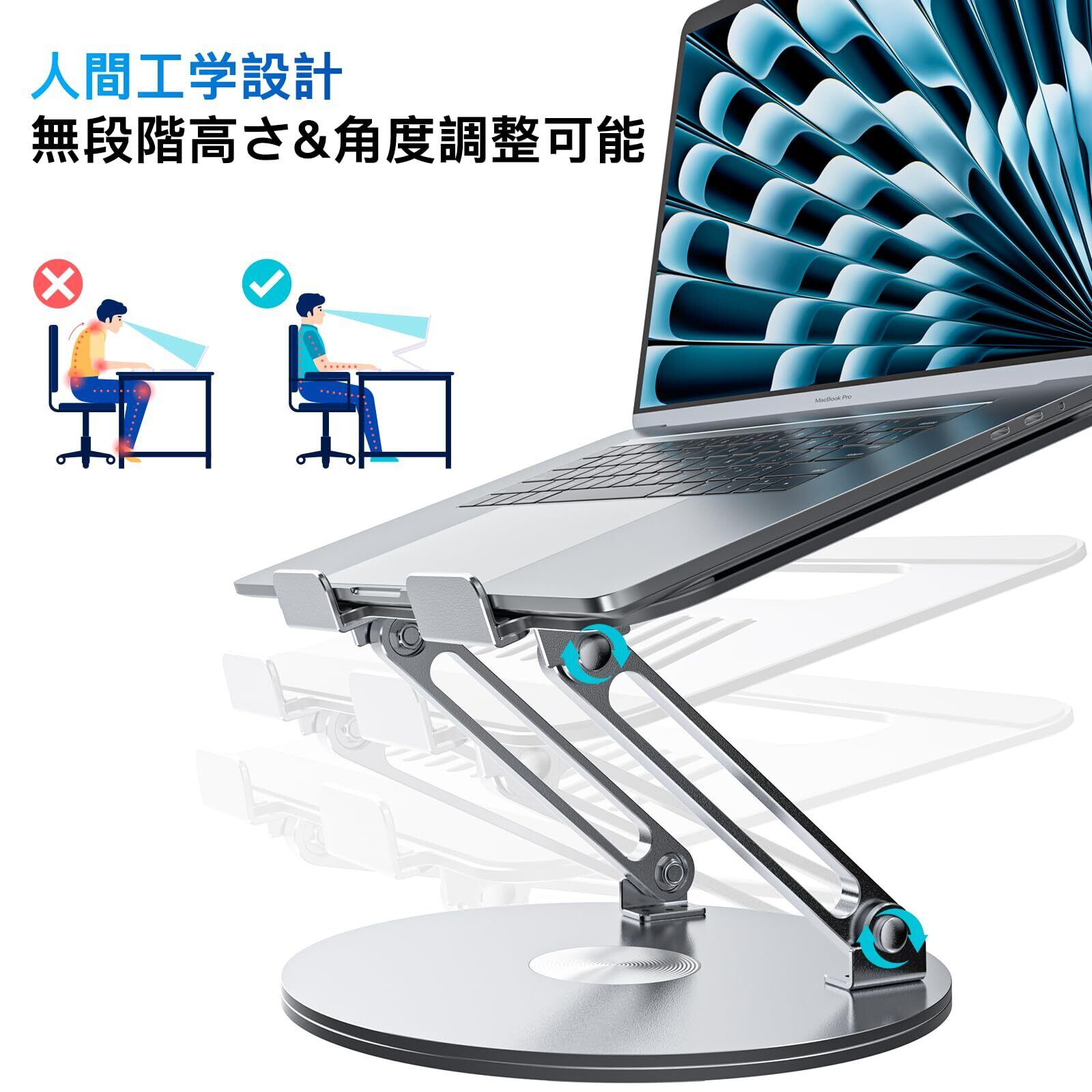 ノートパソコンスタンド 360回転式 PCスタンド タブレットスタンド 折りたたみ式 人間工学設計 高さ&角度調整可能 姿勢改善 腰痛&猫背&肩こり解消 アルミ製軽量 放熱対策 滑り止めゴム パソコンスタンド 在宅仕事 ZOOM会議 Macbook/iPad/ノートPCなど15.6インチまでに対応