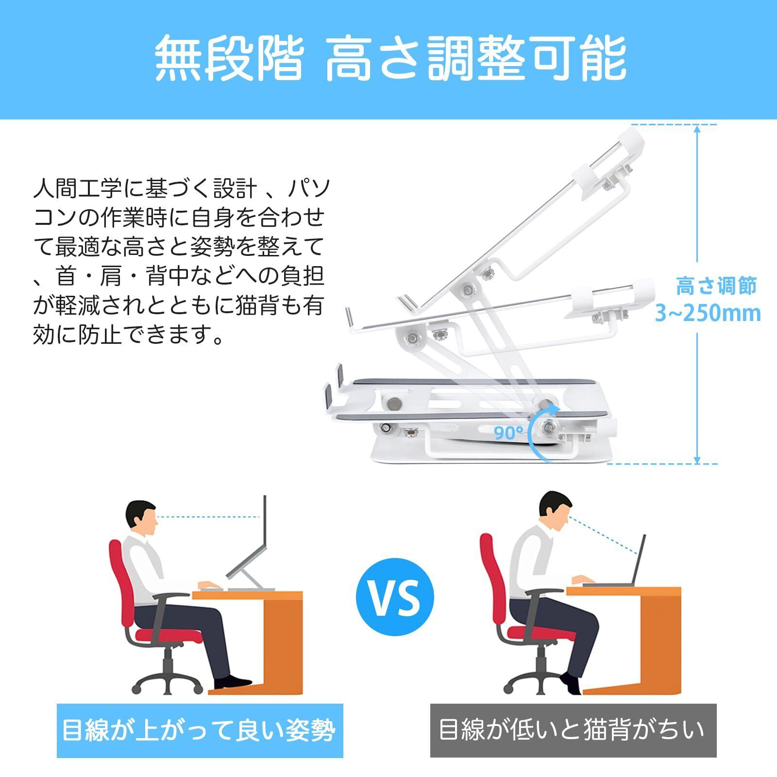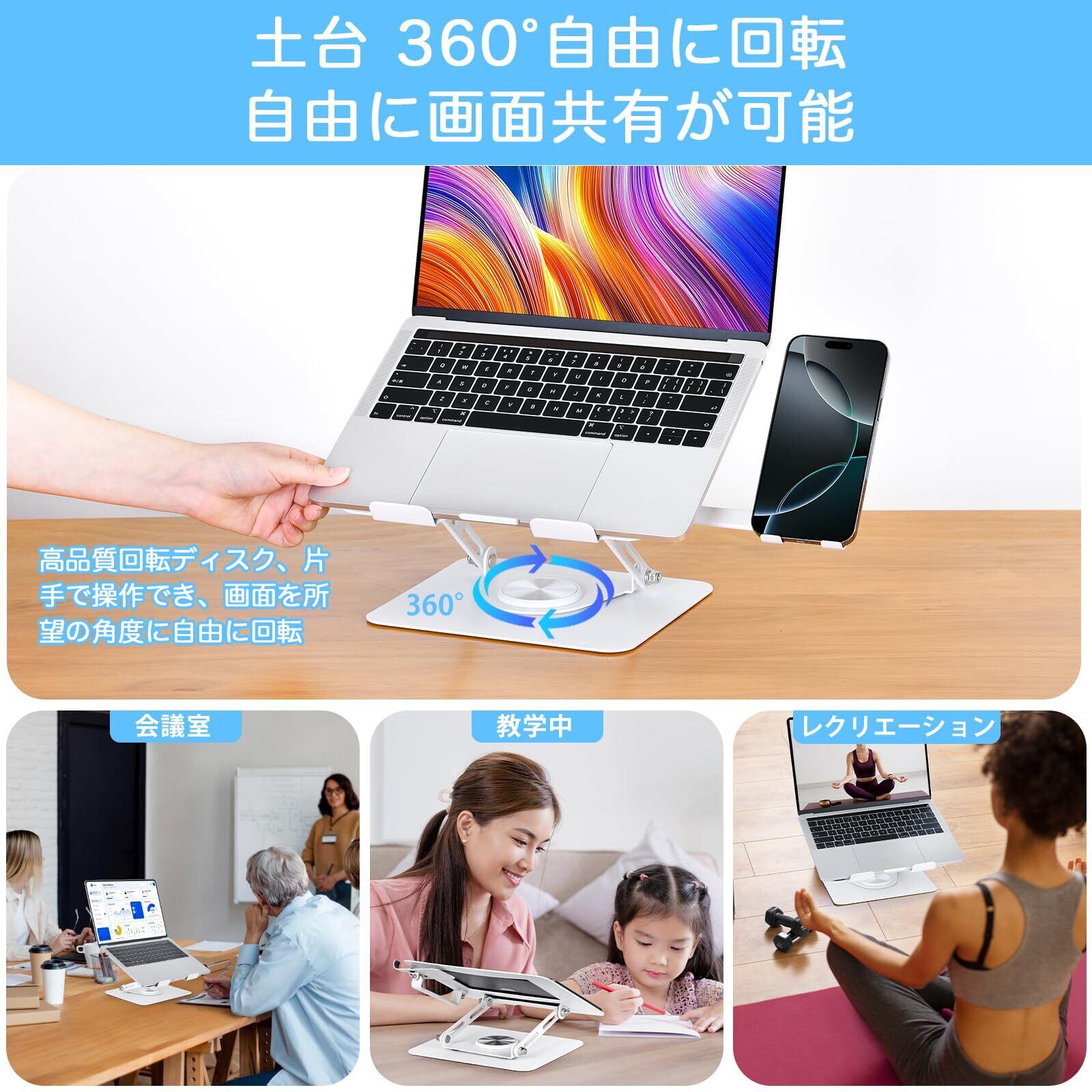 360°回転・無段階調整 :パソコンスタンドは360°自由に回転でき、片手でPCスタンドを軽く押すことで、ノートパソコンをあらゆる角度に回転させ、他人との画面共有を容易にすることができます。人間工学に適した設計で、自分の身長とデスクトップの高さに合わせて、ノートブックPCスタンドの高さを無段階に調整することができます