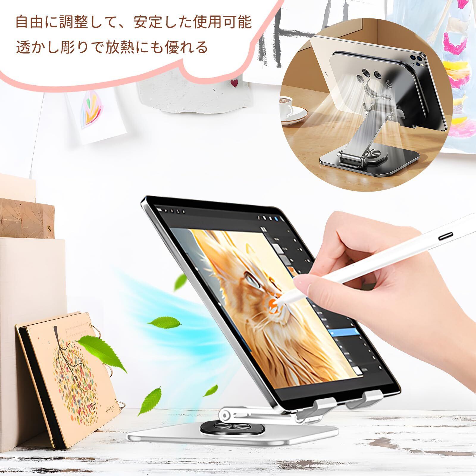 【互換性と便利】さまざまなデバイスのサイズに対応しています。デバイスが横置きでも縦置きでもOK、スタンドにそっと置くだけで両手が解放されます。iPadスタンドはコンパクトで軽量で、持ち運びに便利です。バッグやポケットに簡単に収納できます。どこでも簡単に使えます。