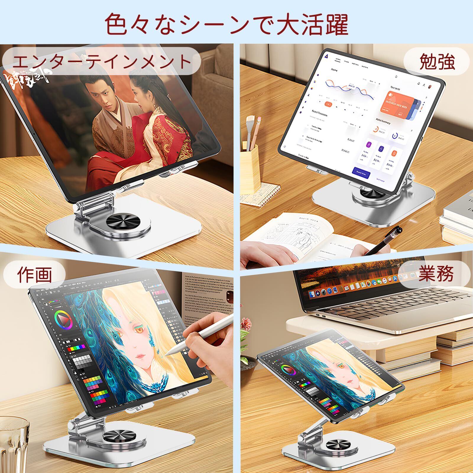 【人間工学】人間工学設計に基づき、このタブレットスタンドは360度回転できます。タブレットスタンドは大幅な角度調整が可能です。映画やビデオを見る際に最適な角度に調整し、快適な視聴体験を提供します。角度を無段階に調整できますので、猫背や腰のたるみなどの悪い癖の改善に役立ちます。