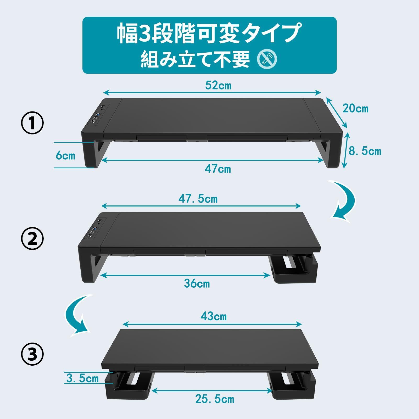 三つの幅調整可能のPCスタンド:43cm、47.5cm、52cmの3つの幅で調整可能です。 幅を自由に折りたたむことができ、パソコンのモニターを8.5cmまで上げることにより、科学的な視覚高さは背中を曲げることを避けられ、首や背中の疲れを効果的に和らげることができます。