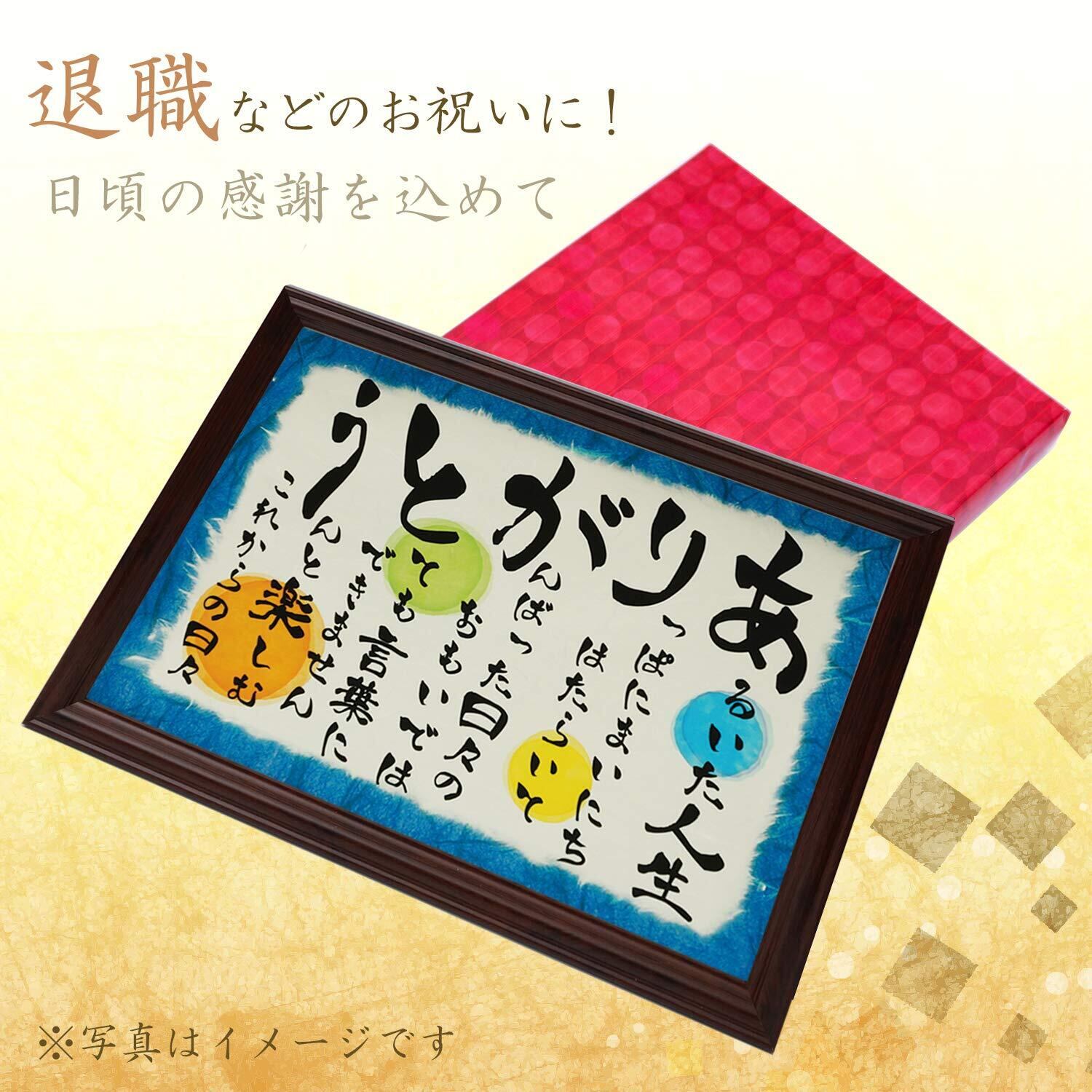 退職のプレゼントとして、上司や同僚、お世話になった方へ贈る感謝の気持ちが伝わる額入りメッセージプレゼント。普段は言葉にして伝えにくい想いをメッセージにして贈ることができます。退職のプレゼントギフトとしてはもちろん、母の日、父の日、敬老の日、誕生日などにもお渡しいただけます。銀の繊維が漉き込まれた上品な風合いの和紙を使用しています。高級感あるフレームと 届いてすぐにお渡しいただける様に、プレゼント用にギフト包装済です。 額サイズ 縦23cm、横32cm リニューアルにより額の形状と色味は写真と異なる場合があります。