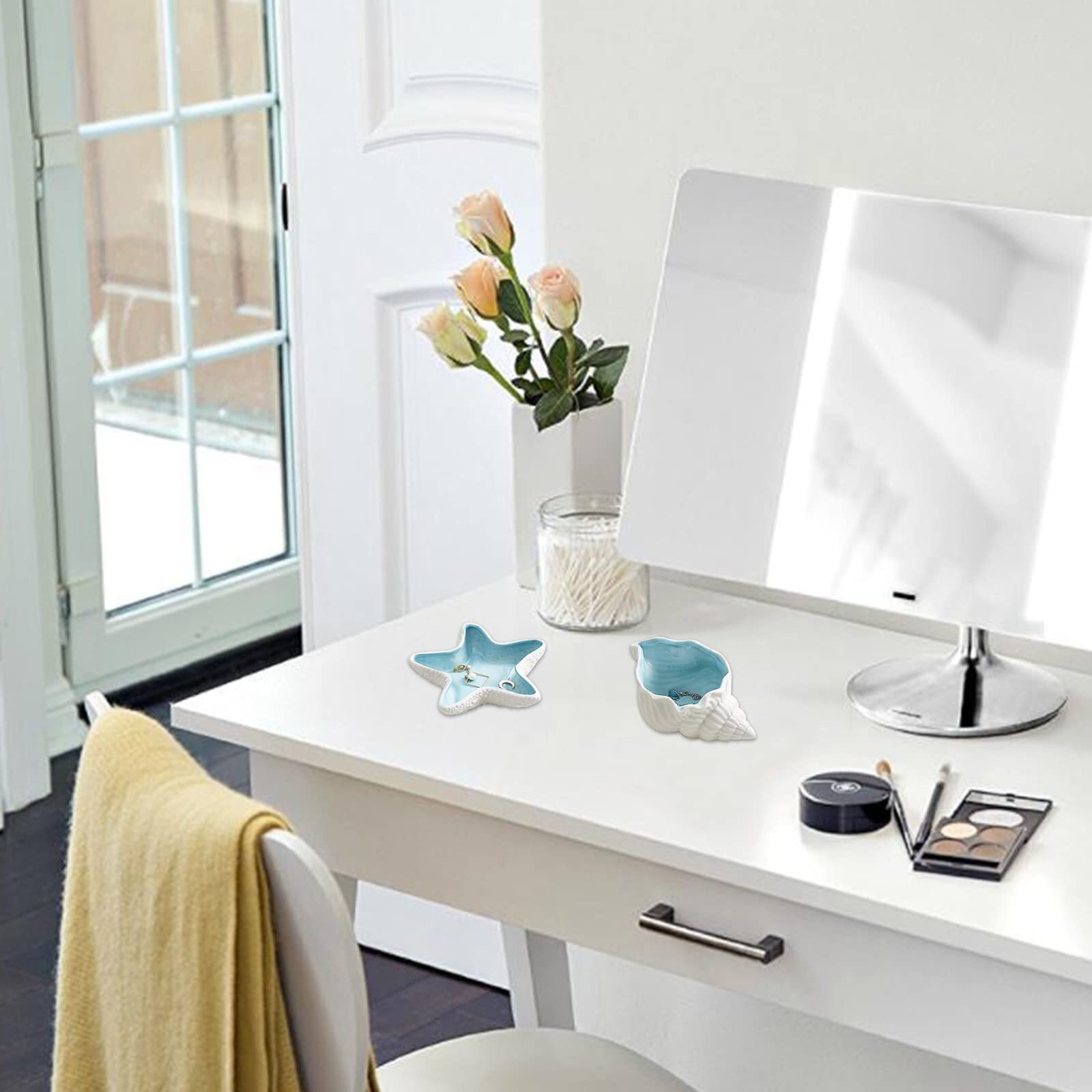 【きれいな外観】:このアクセサリートレイは貝殻の形に設計され、テクスチャーもはっきりと見えます。外観は清潔感のあるホワイトで、内部はブルーとホワイトのミックスでデザインされています。全体的に西海岸的な雰囲気でとても清潔で美しいです。