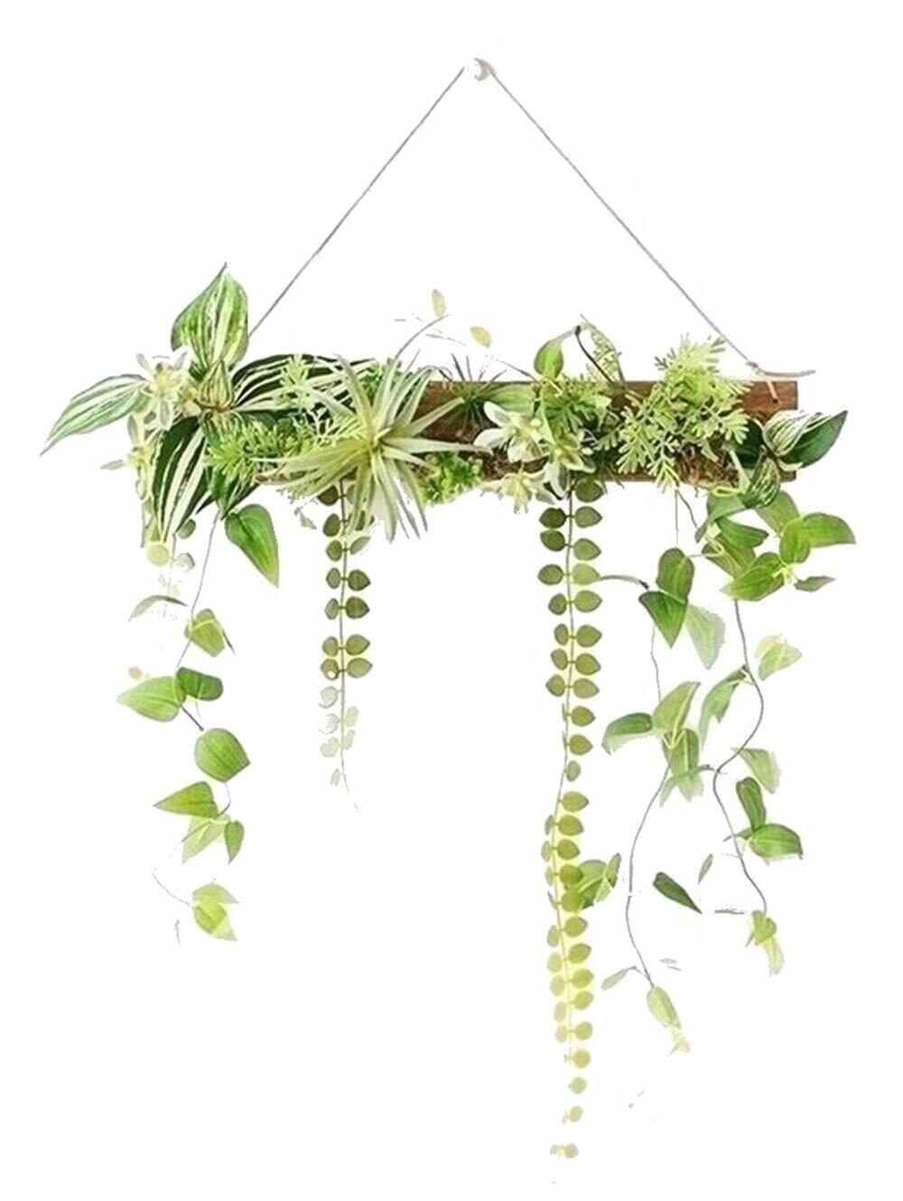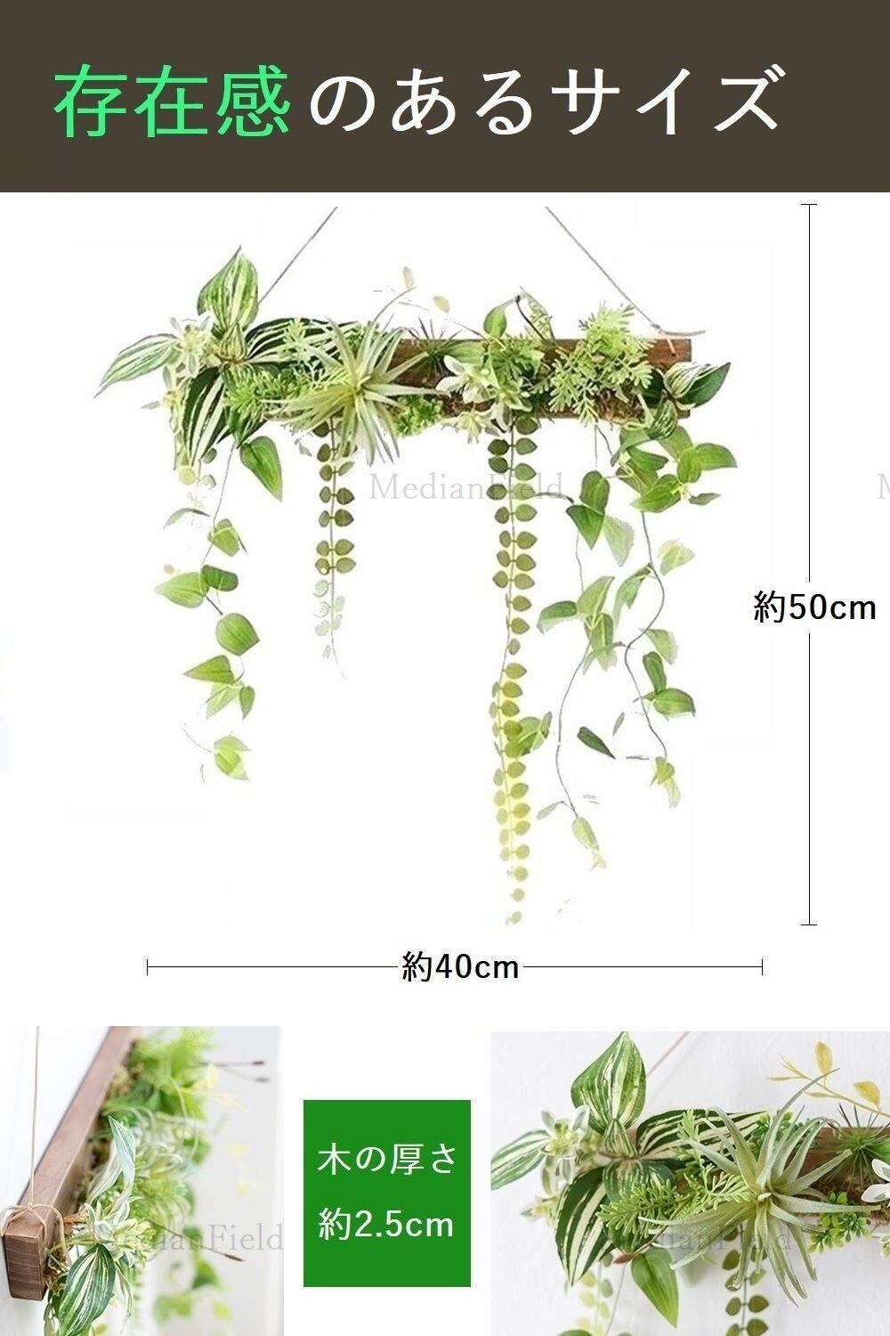 【存在感抜群癒しのウォールグリーン】壁に飾ることができるおしゃれなウォールグリーンです。エアプランツ、ポトス、グリーンリーフなどがバランスよく配置されています。植物は木の板にくっついているので飾るだけで手間いらず。軽いので壁にも飾りやすいです。リビングや寝室、玄関などに飾るだけでお部屋の印象がグッと変わります。約50cm×40cmと程よい大きさなので、手軽に飾って植物をお楽しみいただけます。他の植物や花を足してアレンジしても素敵です。