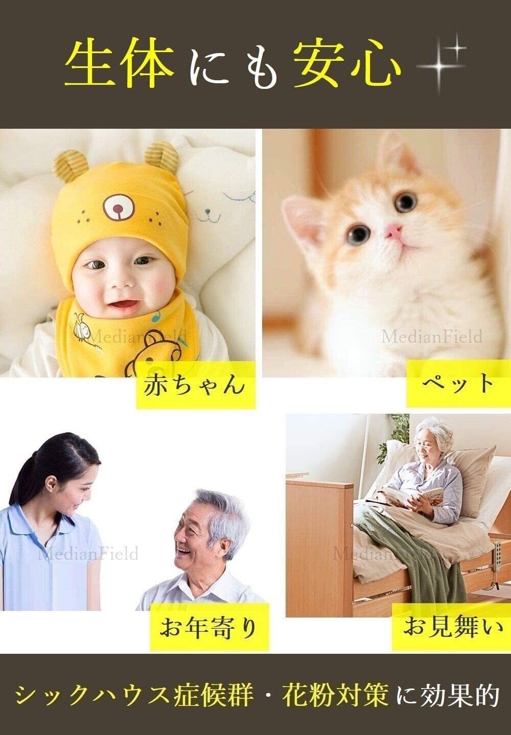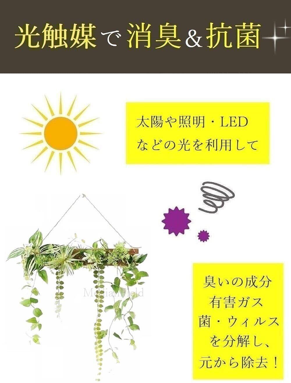 【生体にも安心】光触媒は二酸化チタンが主原料なので、食品や化粧品の添加物にも使用されており、赤ちゃんや小さなお子様、ペット、お年寄りなどがいるご家庭でも安心して飾ることができます。 花粉やホルムアルデヒドなどにも有効なので、花粉症対策やシックハウス症候群にも効果的です。お見舞いやプレゼントなどにもおすすめです。 光触媒は光のエネルギーを利用しておりますので電気代がかからず、ランニングコストが不要です。