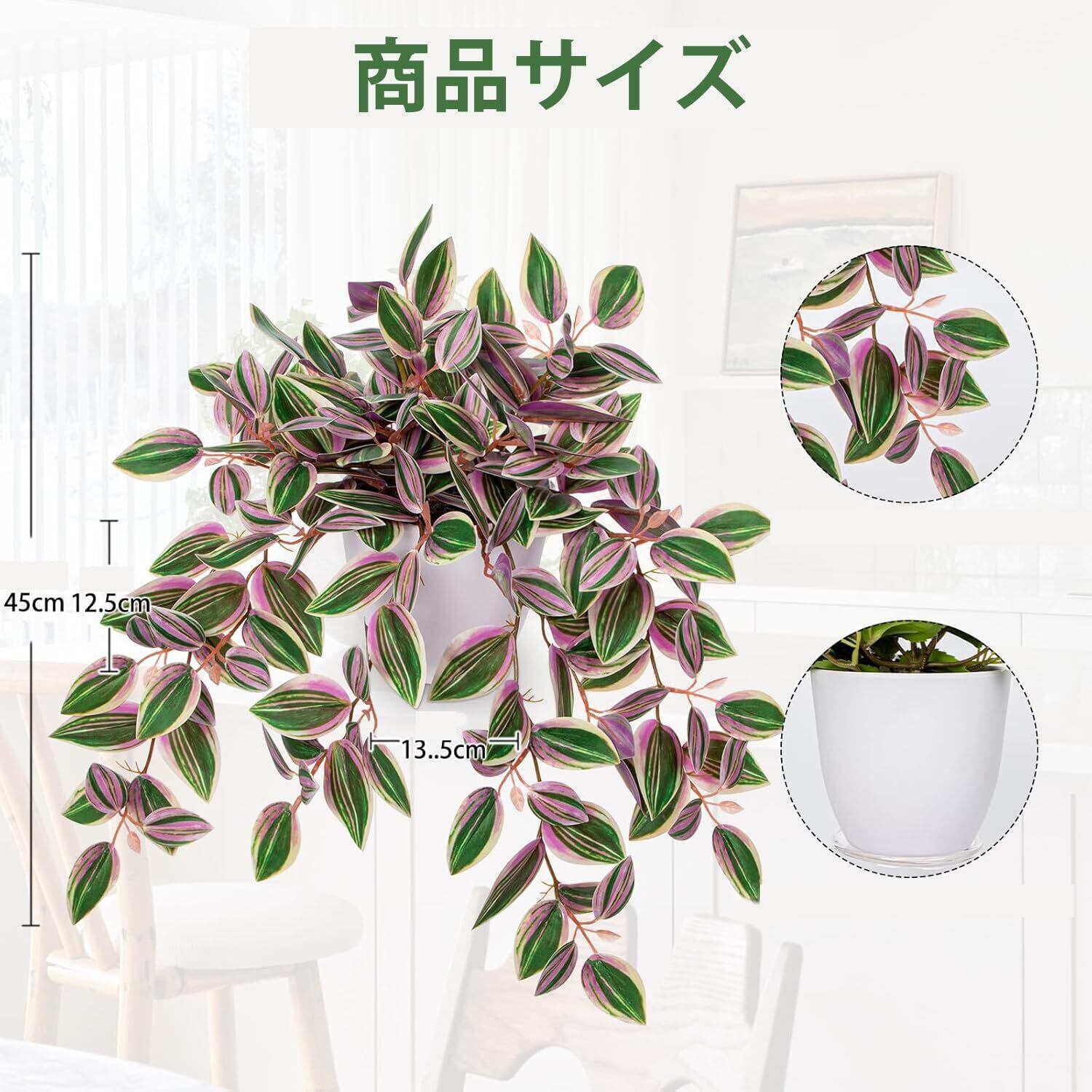 【仕様&高品質】全高さ:45CM、ポット:13.5*12.5CM。フェイクグリーンは高品質のPEやシルク材質を採用しております。グラデーション・ハローの技法を用い、葉は自然に着色されています。葉は厚く、質感がよく、遠目には本物と見間違うほどリアルです。植物は内にワイヤーを含み、細部まで心入れの作りで、葉落ち無く何度も使えて長持ちできます。