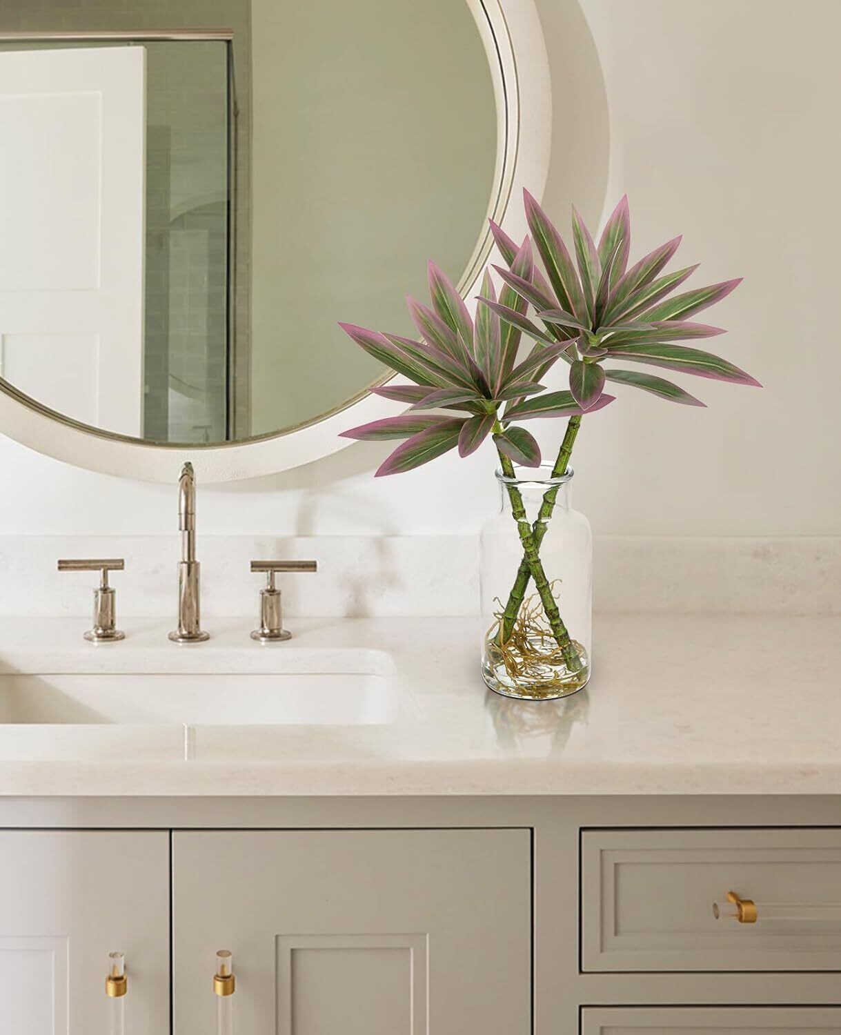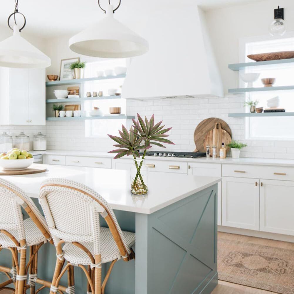 【おしゃれな花瓶&人工水】すぐに飾れる花瓶付き人工観葉植物です。おしゃれな透明のガラスで植物がよく映えます。また、本物のように見えるお水はマジカルウォーター(人工水)で、無色透明なシリコン樹脂ででできており、いつも瑞々しいフェイクグリーンを楽しむことができます。固まっているので、傾けてもこぼれる心配はありません。茎なども固定されるので、美しいアレンジが崩れません。
