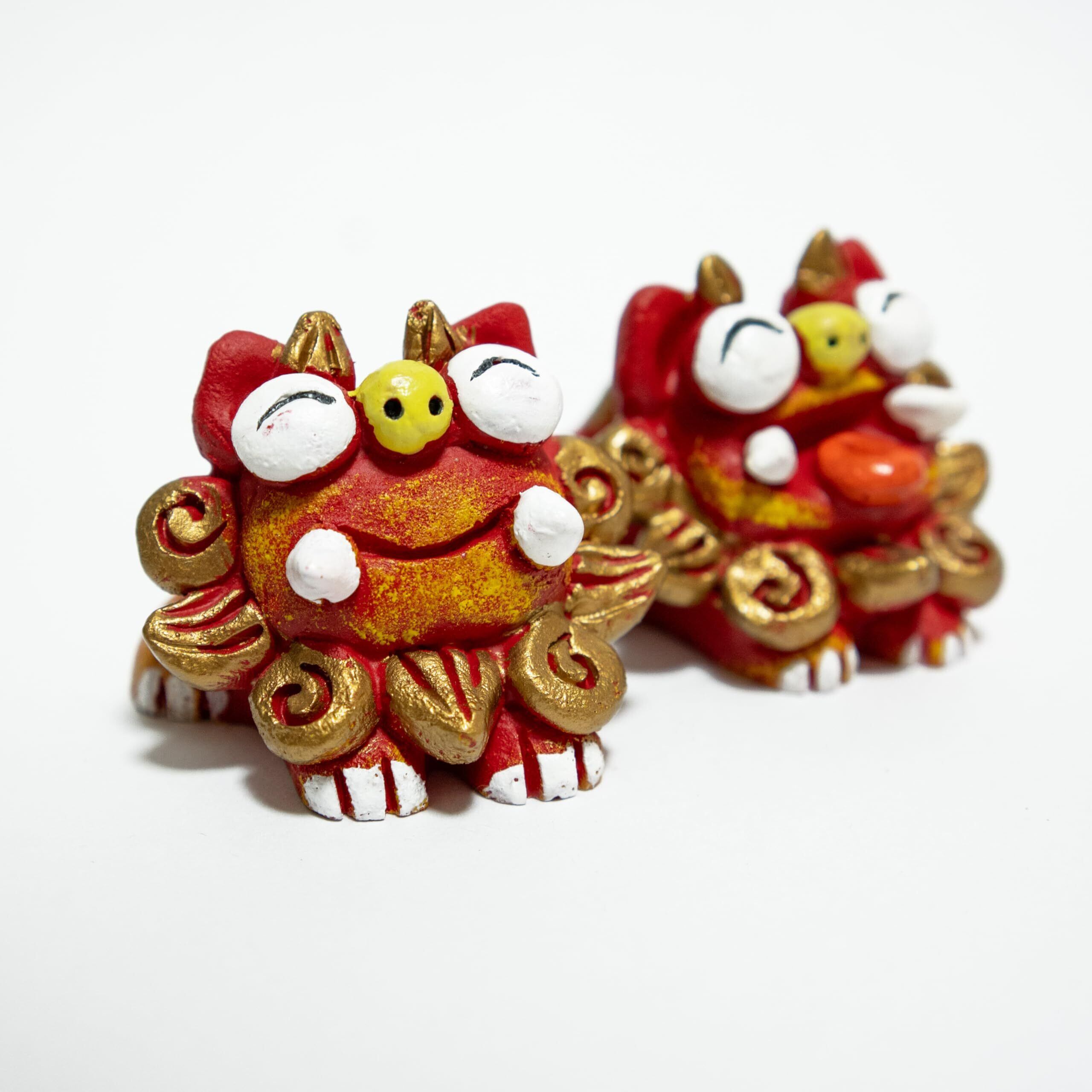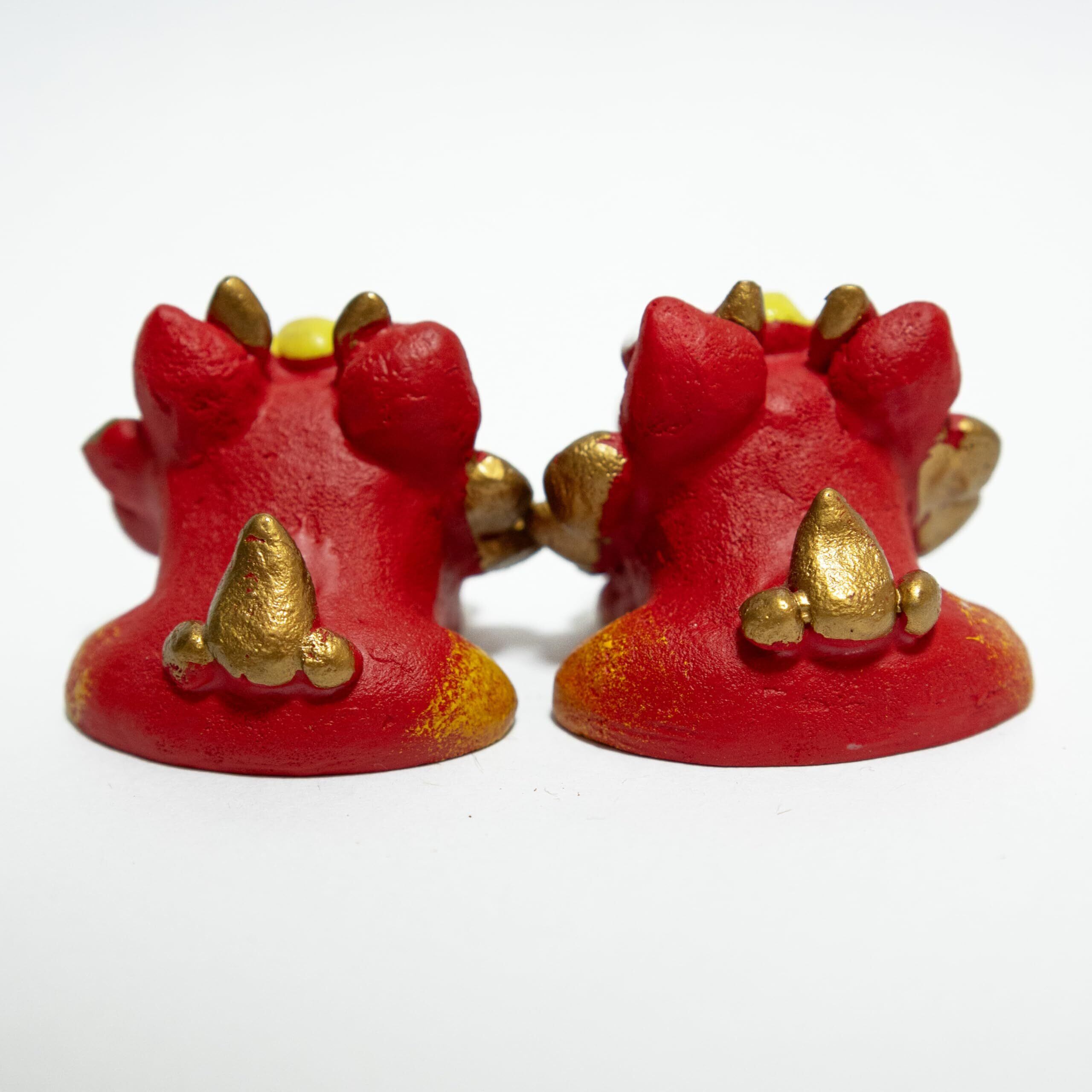 オスとメスのペアで、全体は力強い赤色で統一され、たてがみとしっぽには鮮やかな赤色と金色が施されています。