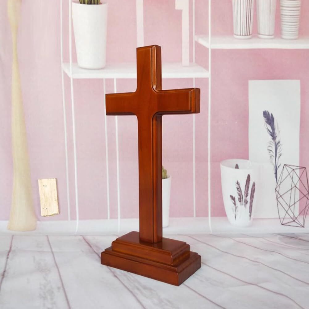 【仕様】木制オーク色の十字架置物、コーナーは磨くプロセス、●スタイル:高17cm。サイズ:十字架15cm、木ベース(長さ*高さ8cm*2cm)。