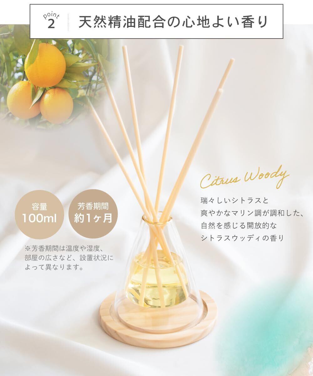『天然精油配合の心地よい香り』シトラスウッディは瑞々しいシトラスと爽やかなマリン調が調和した、自然を感じる開放的な香り。フレッシュな透明感の中に、ほんのりと落ち着きのある甘さが広がります。