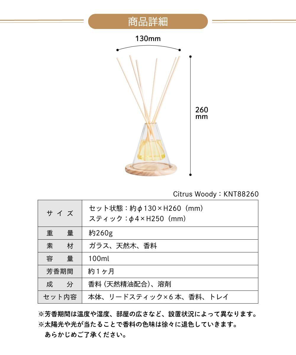 【サイズ】セット状態:約φ130×H260(mm)、スティック:φ4×H250(mm)、トレイ:φ120×H10(mm)【重量】約260g【素材】ガラス・天然木・香料【容量】100ml【芳香期間】約1ヶ月【成分】香料(天然精油配合)、溶剤【セット内容】本体、リードスティック×6本、香料、トレイ