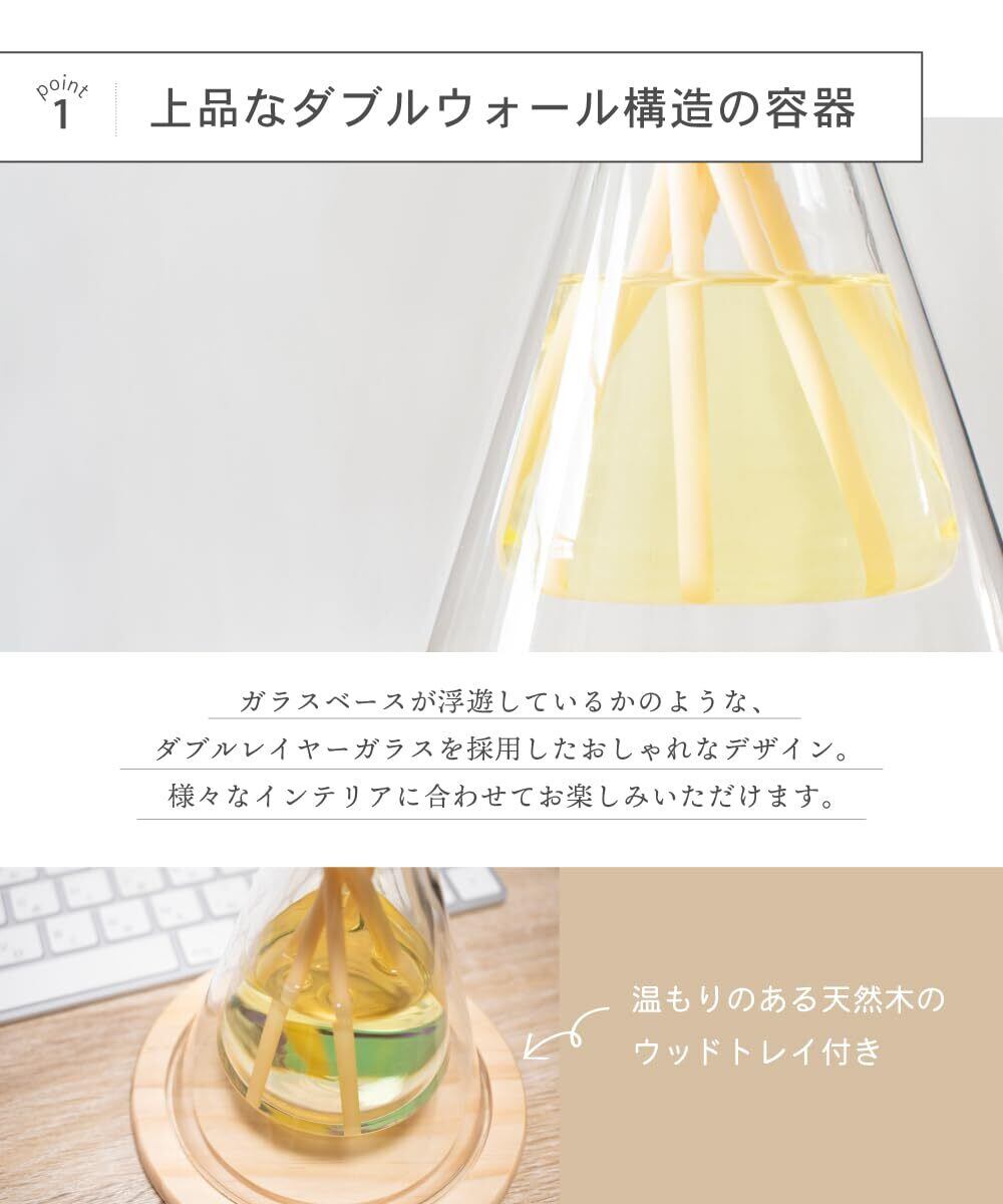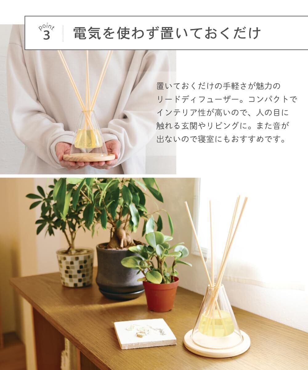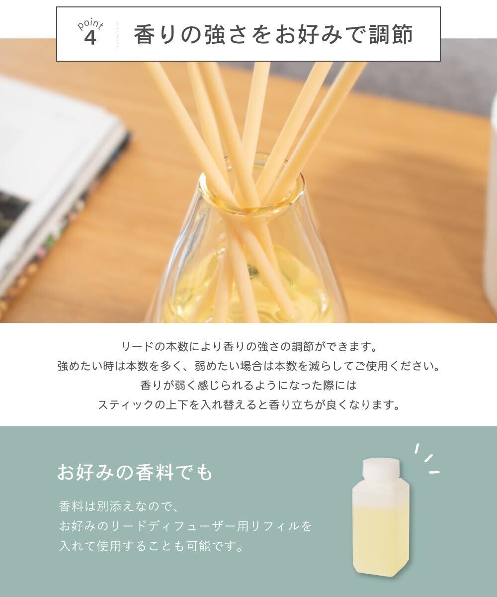 『香りの強さをお好みで調節』リードの本数により香りの強さの調節ができます。強めたい時は本数を多く、弱めたい場合は本数を減らしてご使用ください。香りが弱く感じられるようになった際にはスティックの上下を入れ替えると香り立ちが良くなります。