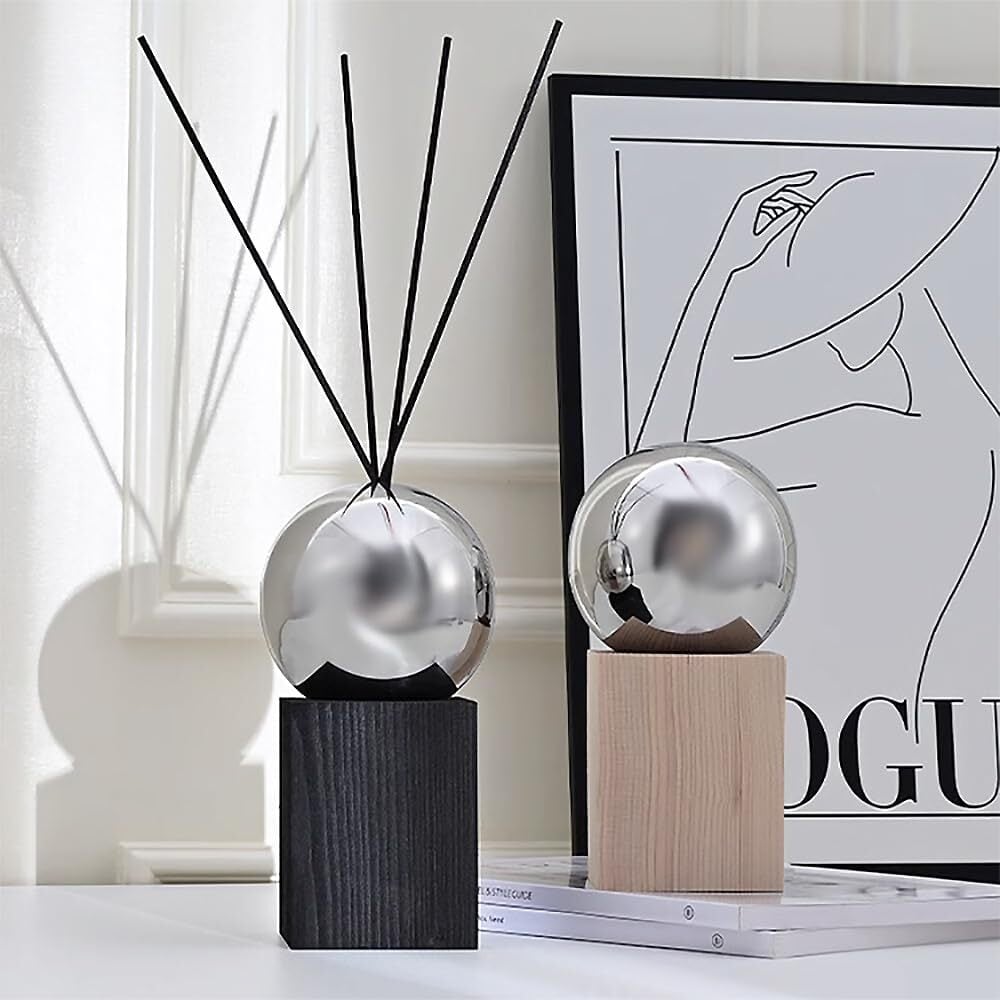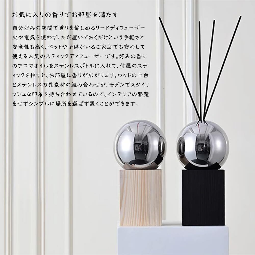 お気に入りの香りでお部屋を満たし、自分好みの空間で香りを愉しめるリードディフューザー容器です。 火や電気を使わず、ただ置いておくだけという手軽さと安全性も高く、ペットや子供がいるご家庭でも安心して使える人気のスティックディフューザーの容器です。 好みの香りのアロマオイルをステンレスボトルに入れて、付属のスティックを挿すと、お部屋に香りが広がります。 ウッドの土台とステンレスの異素材の組み合わせが、モダンでスタイリッシュな印象を持ち合わせているので、インテリアの邪魔をせずシンプルに場所を選ばず置くことができます。