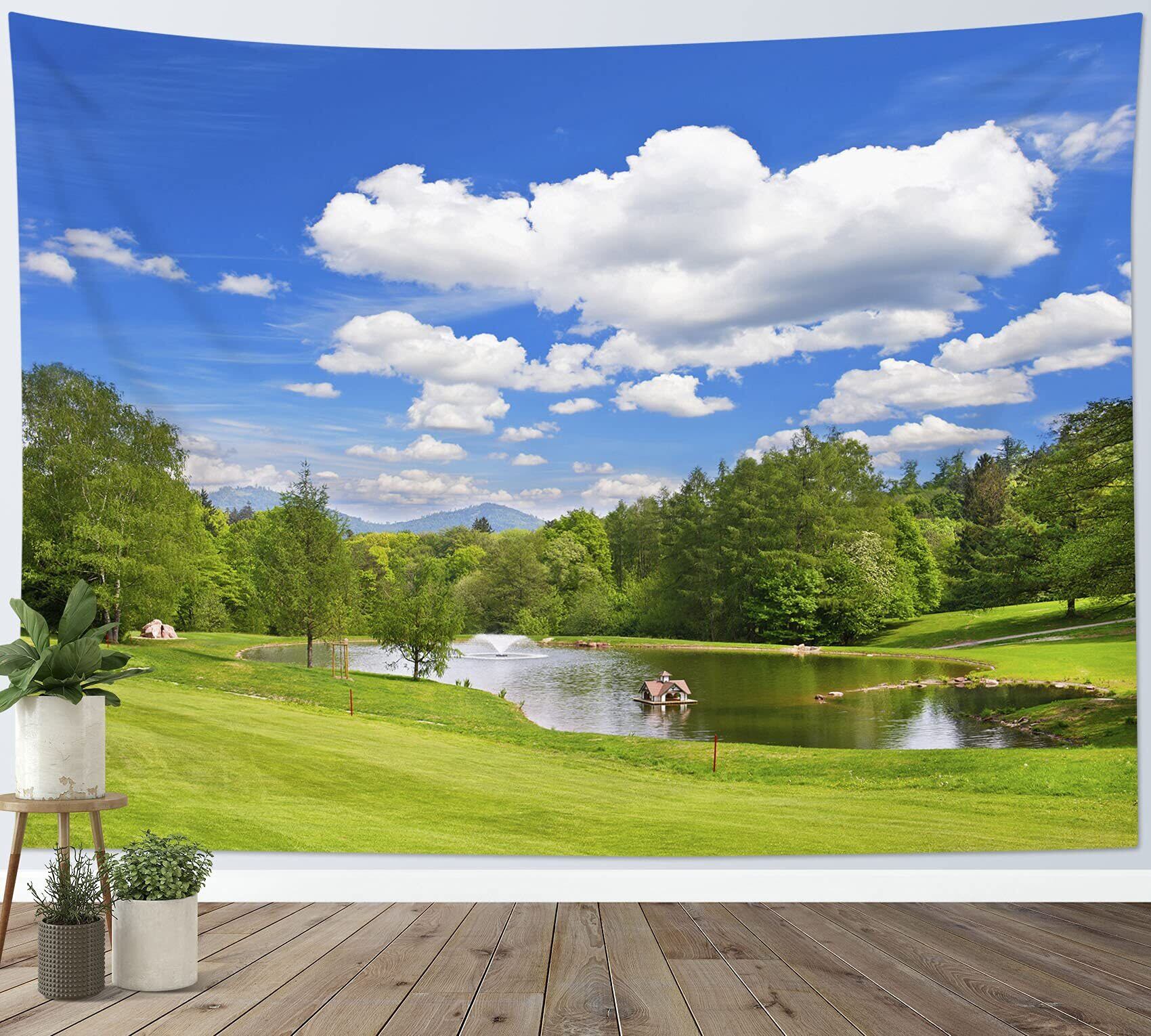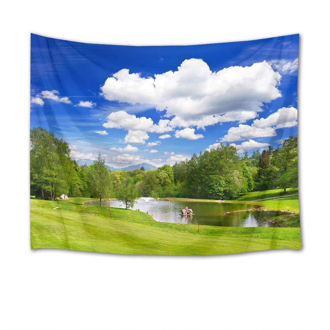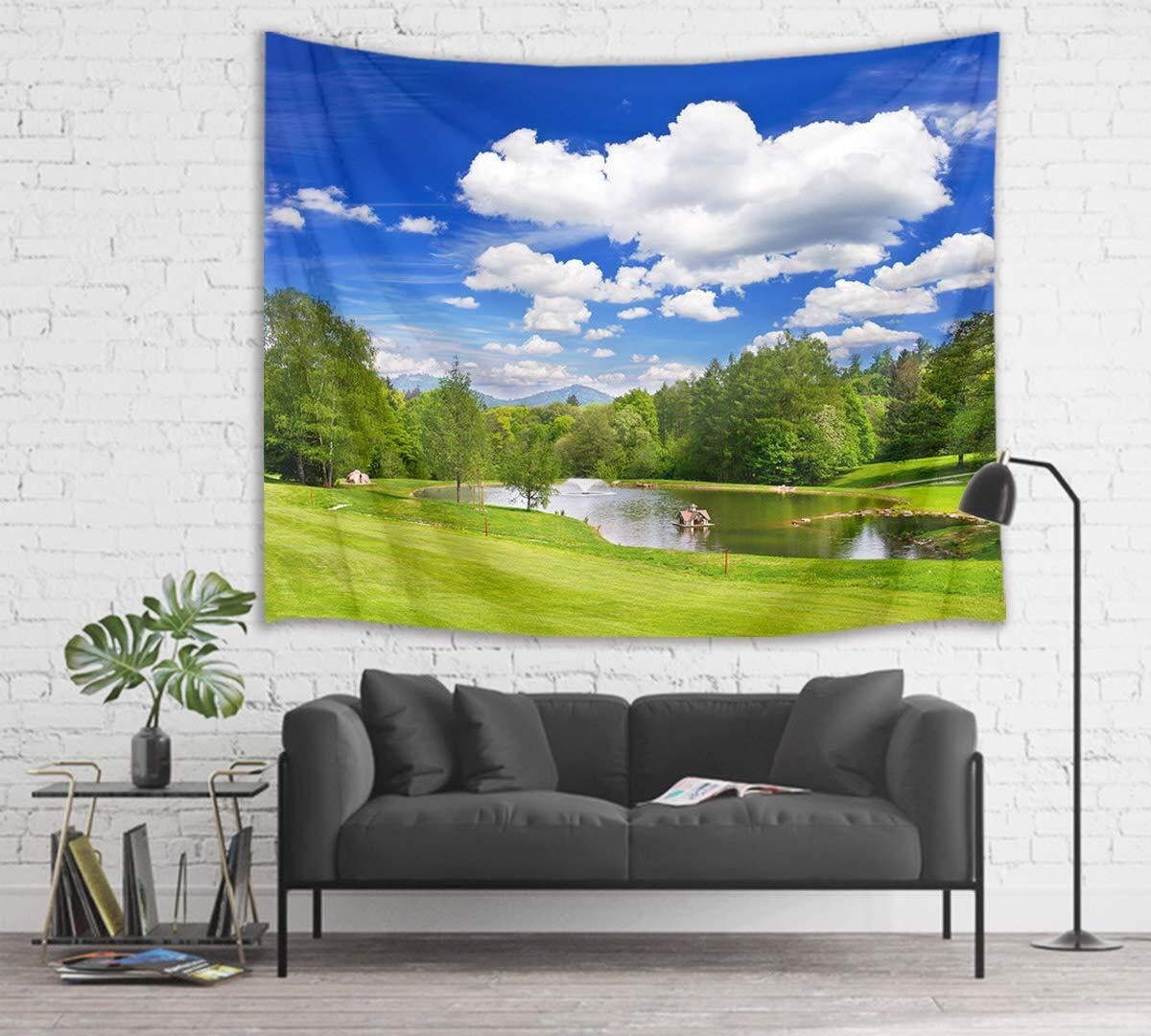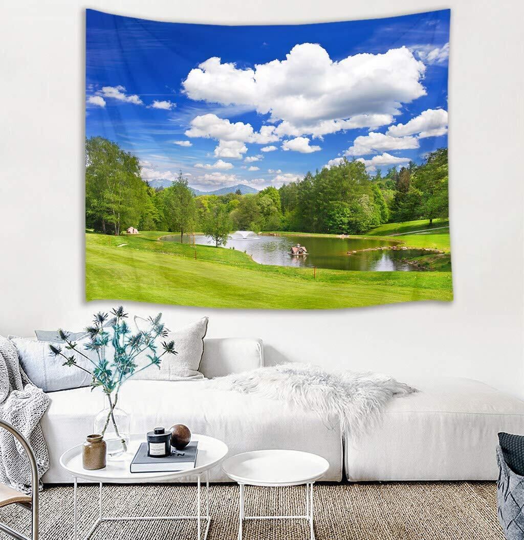 LB 自然風景タペストリー 森の湖 青空と白雲 おしゃれ壁掛け 癒しの景色 装飾布 インテリア モダン 多機能 布ポスター お店 壁や窓の飾り 個性ギフト 新居祝い 布製 (150x100cm)