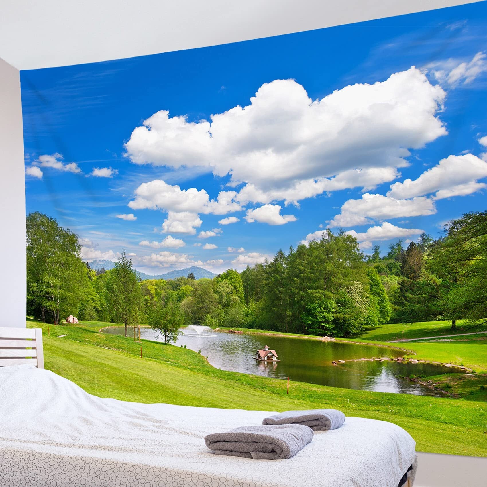 【特価セール】LB 自然風景タペストリー 森の湖 青空と白雲 おしゃれ壁掛け 癒しの景色 装飾布 インテリア モダン 多機能 布ポスター お店 壁や窓の飾り 個性ギフト 新居祝い 布製 (150x100cm) | paghag