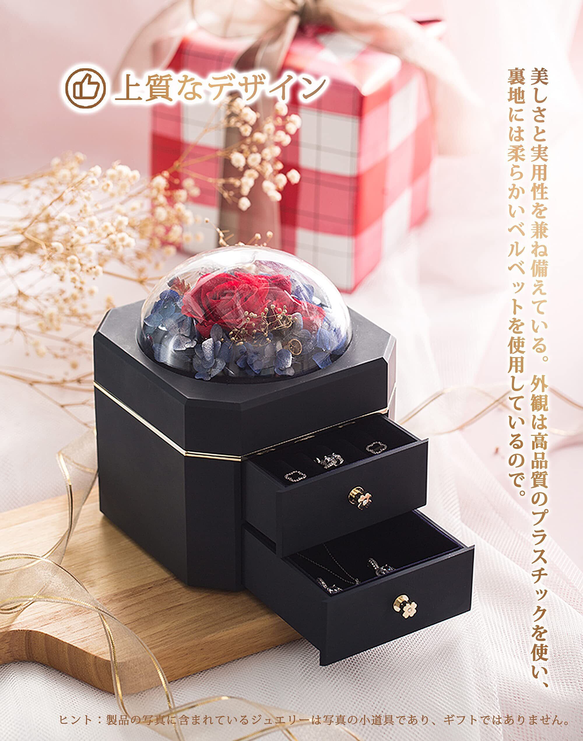 材質と仕様: 花:ブリザードフラワー 、透明カバー素材:アクリル、内装材:かいベルベット 長さ11.5CM幅11.5CM高さ13CM。重量:約413G。内部のデザインも巧妙で、収納スペースを最大限に実現すると同時に、おしゃれ感を保っている。