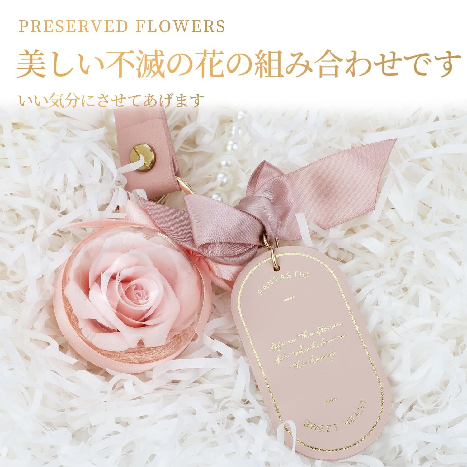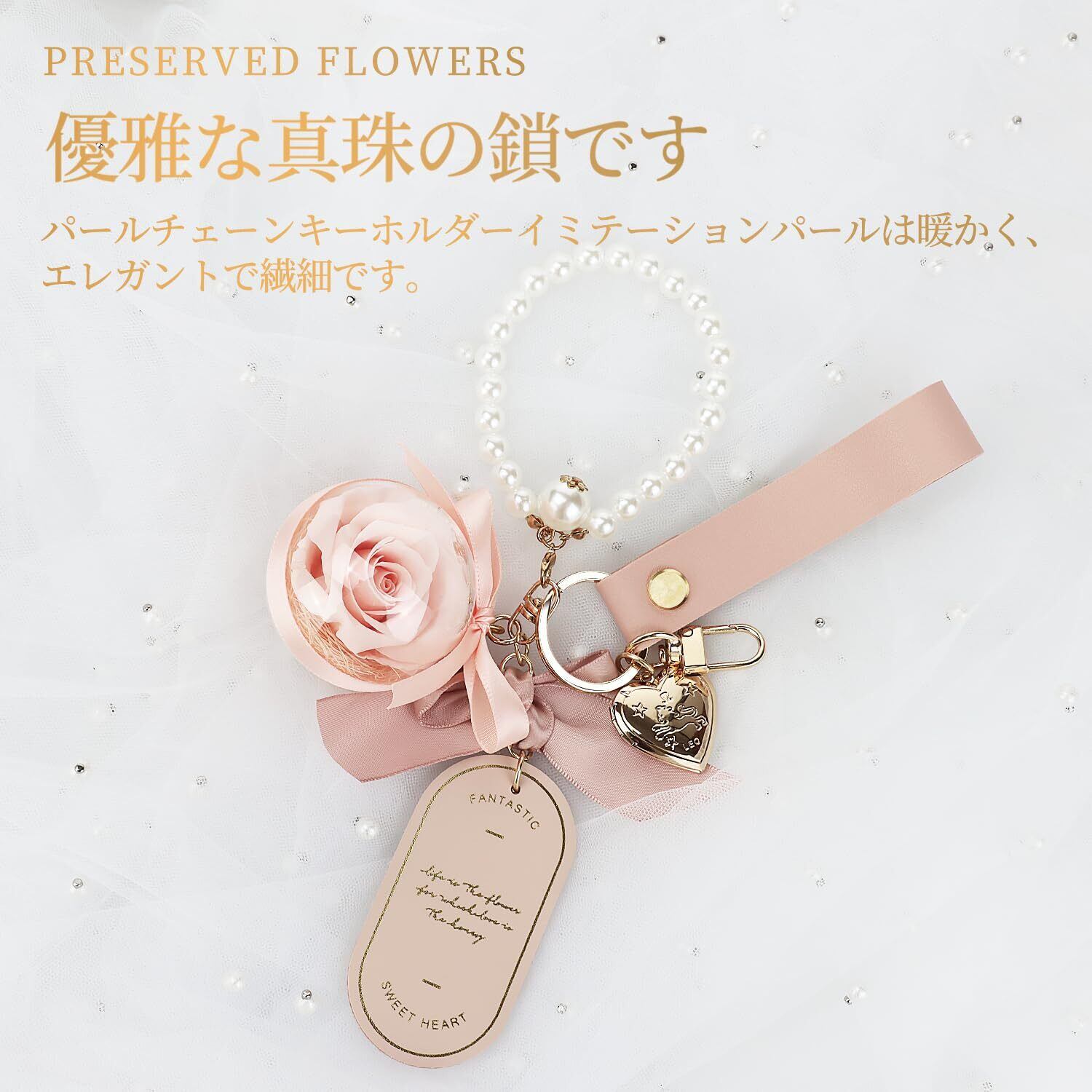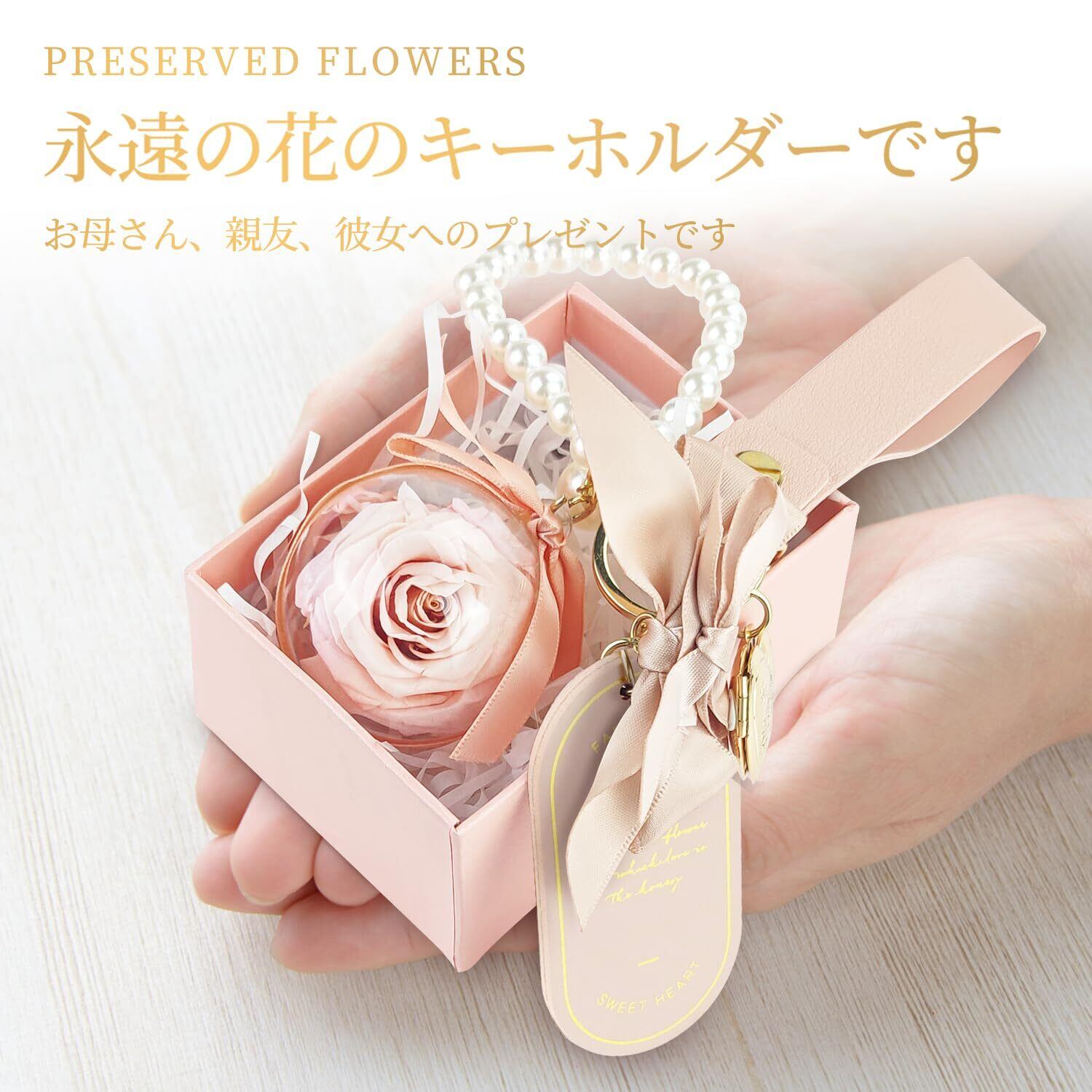 持ち運びができる可愛いアクセサリー『プリザーブドフラワーボール キーホルダー』可愛いお花を持ち運びしたいって言う お客様の声から誕生した。母の日にとても人気です。枯れない魔法の花 貴重なマイクロローズのプリザーブドフラワーを透明アクリルにぎゅっと詰め込み、その他のアクセサリー:キーホルダー、キーリング、レザー ベルトル、プラスチック真珠、合金の小さな写真立て、シルクのリボン。