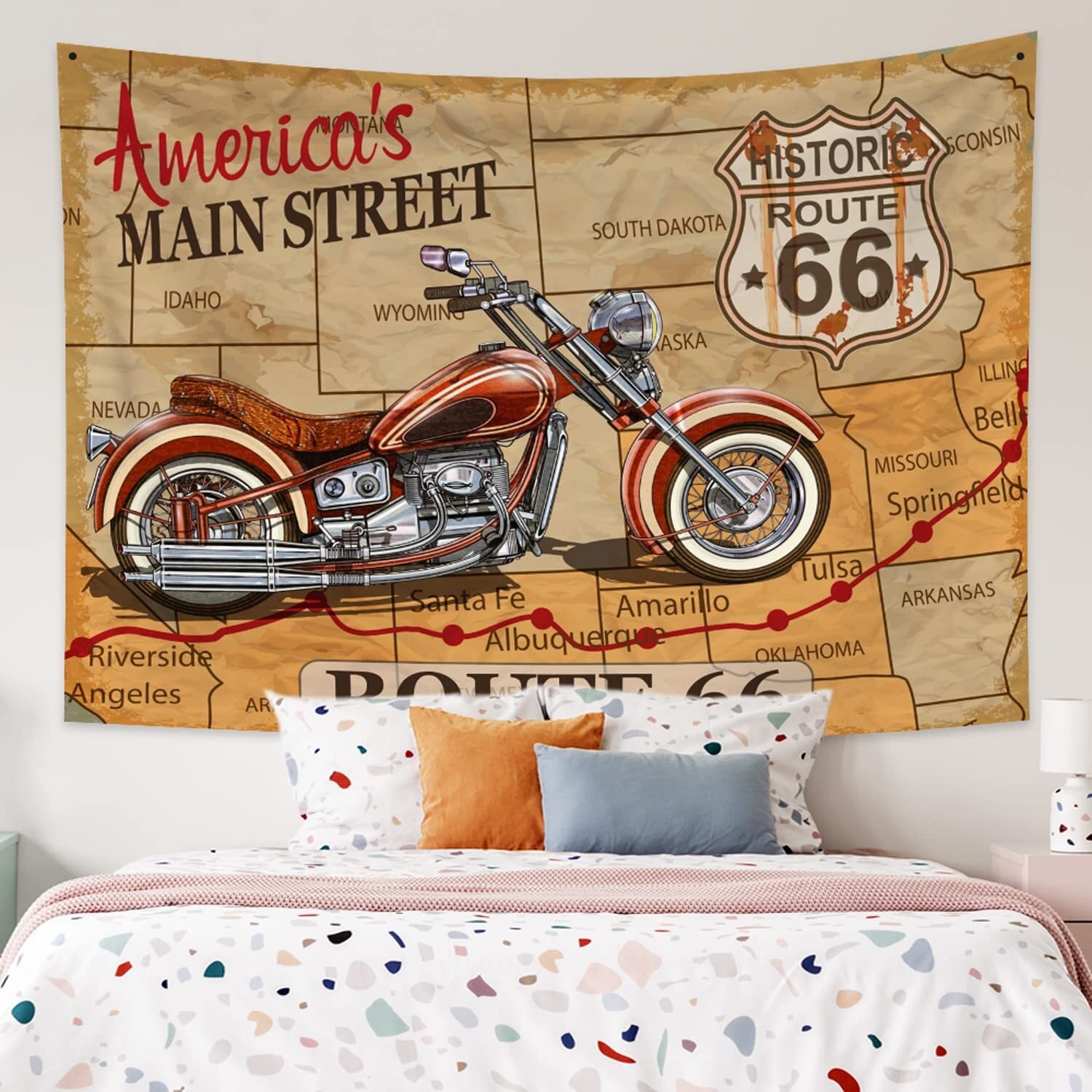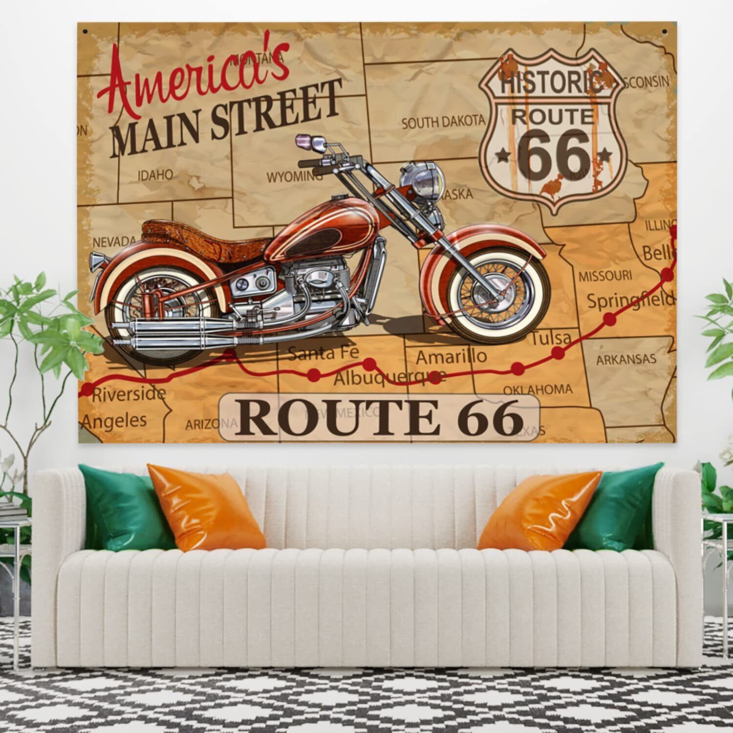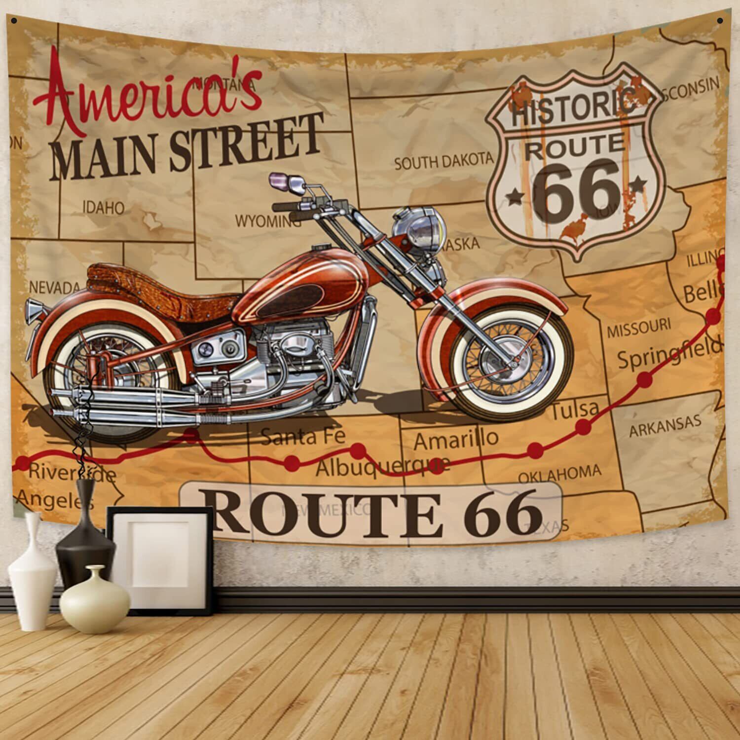 Qinunipoto タペストリー ルート66 route66 地図の柄 レトロなバイク アメリカン 米国 150x100cm アート デコレーション 多機能 おしゃれ 壁掛け インテリア 雰囲気転換 飾り 布ポスター ビデオ会議 撮影用 背景布 新居お祝い 個性ギフト ポリエステル製